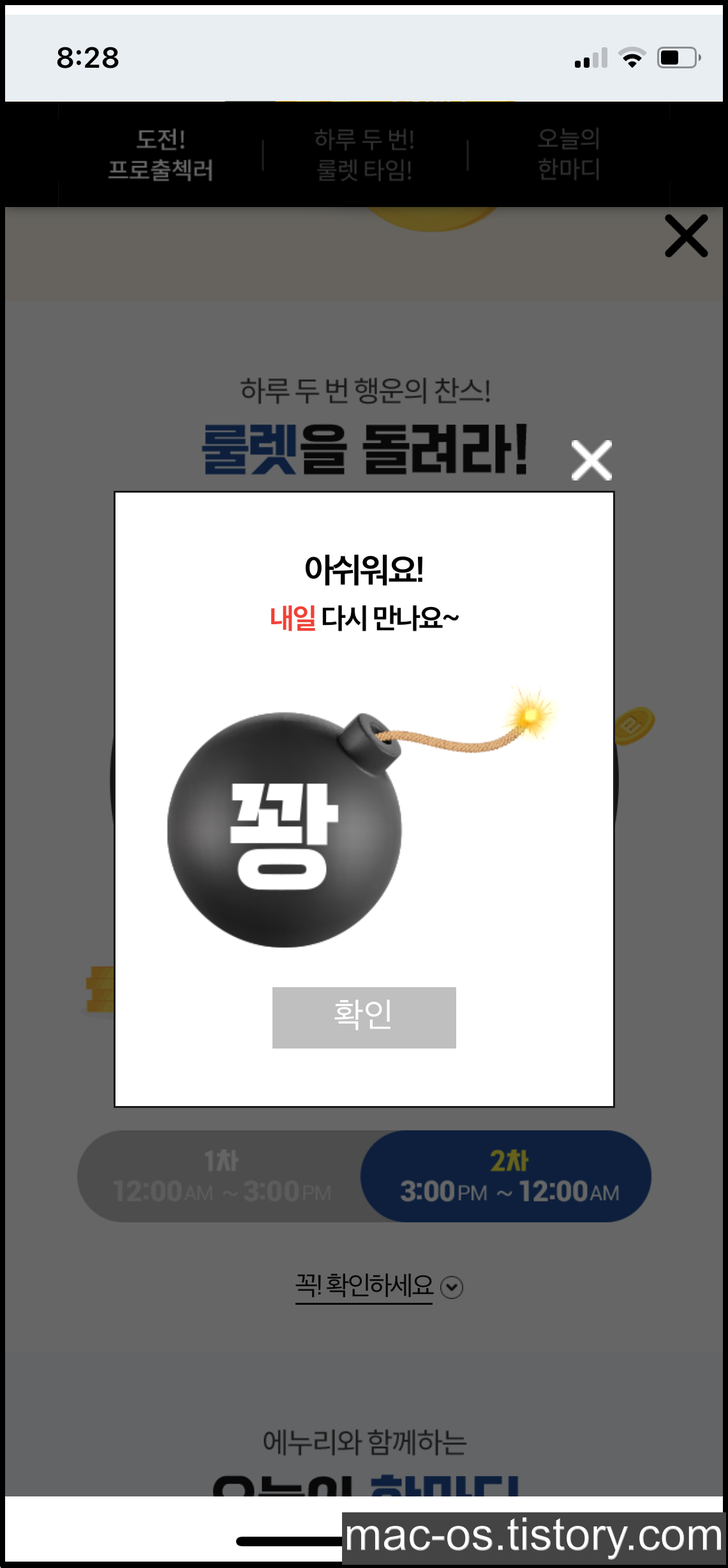 출석체크 페이지에서 하루에 2번 룰렛을 돌리실 수 있습니다. 룰렛을 돌려 운이 좋다면 던킨도너츠 도너츠 6개팩(9,000원 상당)을 얻을 수도 있네요.