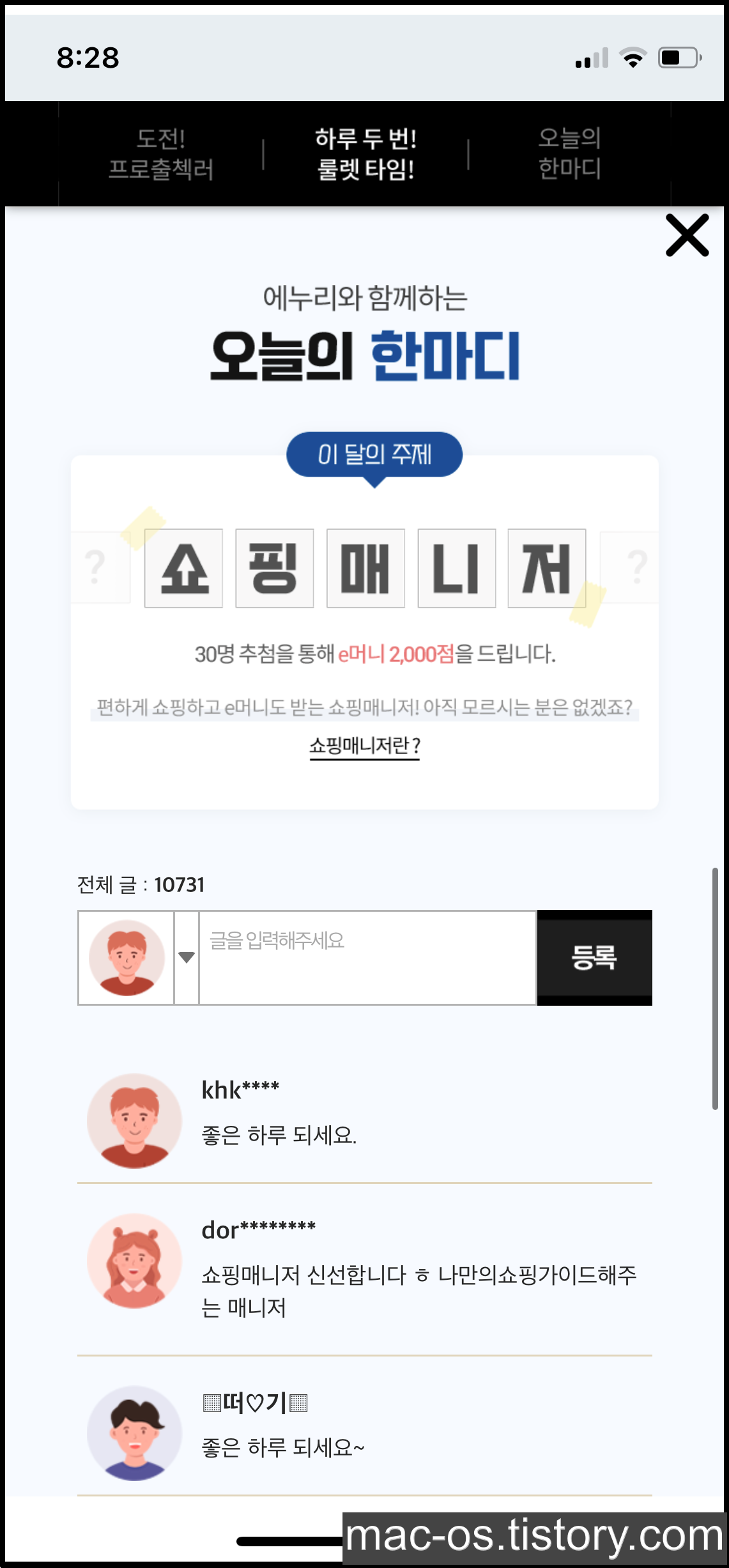 조금 더 화면을 내려보면 오늘의 한마디라는 컨텐츠도 있는데요. 이 달의 주제에 맞는 댓글을 작성하면 30명 추첨을 통해 e머니 2,000점을 받을 수 있습니다.