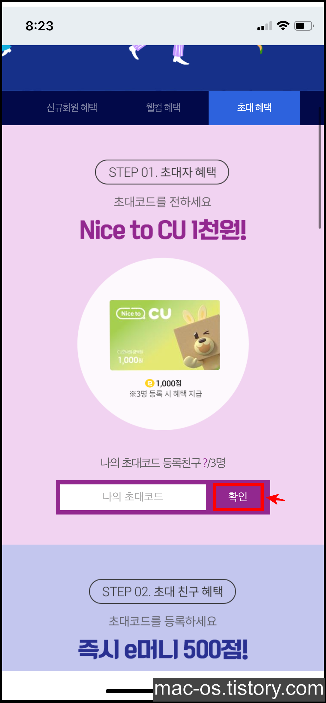 화면을 상단으로 올리면 자신의 초대코드를 발급받는 것도 가능합니다.