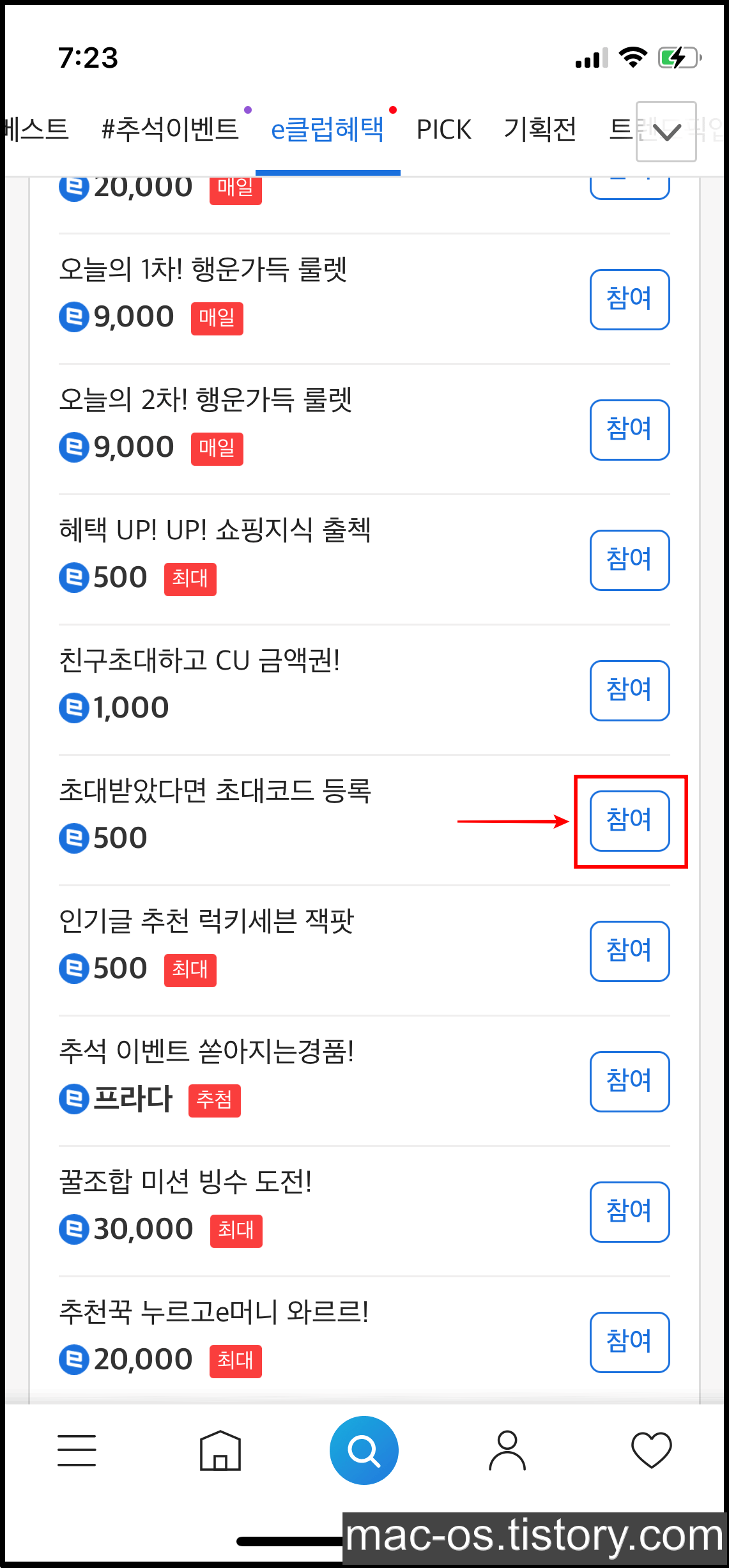 [e클럽혜택] > [이벤트적립] > [참여이벤트]에서 '초대받았다면 초대코드 등록'의 [참여] 버튼을 눌러주세요.