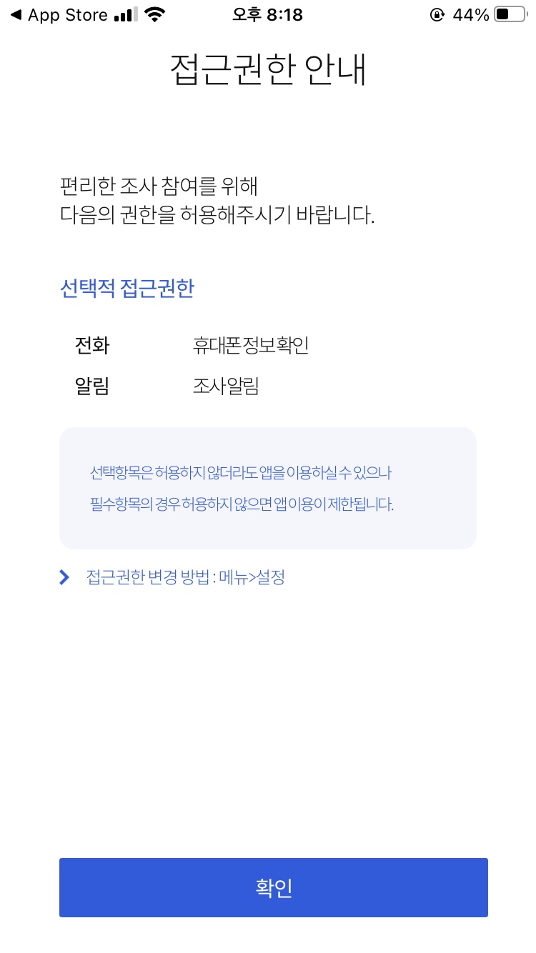 앱스토어에서 엠브레인 패널파워를 검색하면 앱을 설치하실 수 있습니다. 앱을 실행하고 접근권한을 허용합니다.