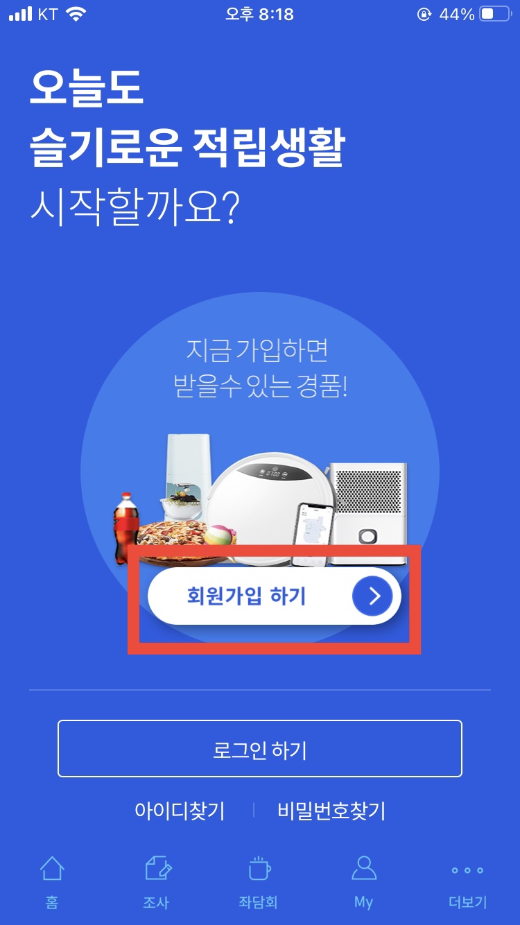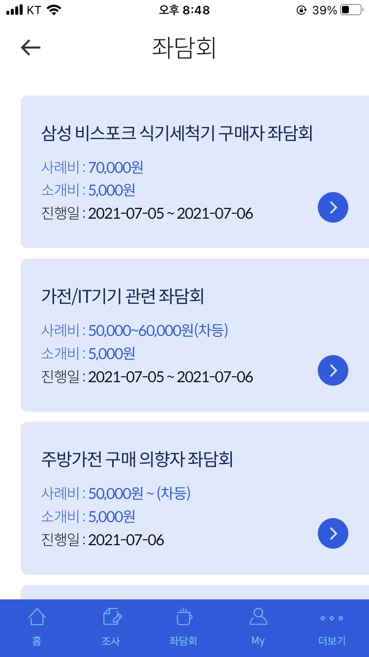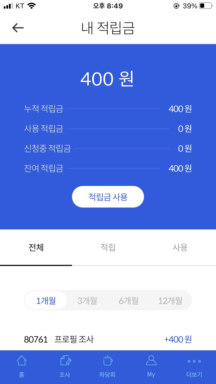 알림으로 설문이 왔을 때, 설문조사에 참여하여 포인트를 적립받는 형식입니다. 그리고 특이한 점이 있다면 '좌담회'라는 것이 있다는건데요.