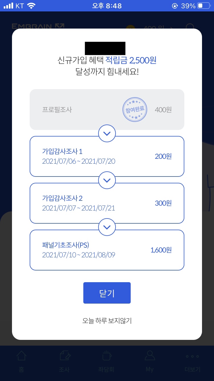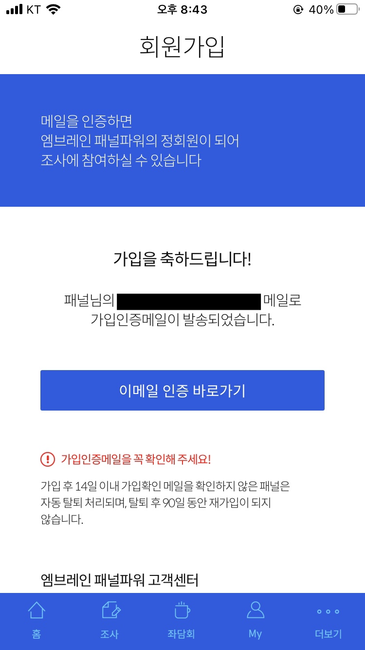 회원가입이 완료되었습니다. 이제 이메일을 인증하시면 정회원이 됩니다. 이메일 인증 후, 3분 정도 걸리는 패널 프로필 조사가 준비되어 있는데 해당 설문 참여 시 400원이 적립됩니다.