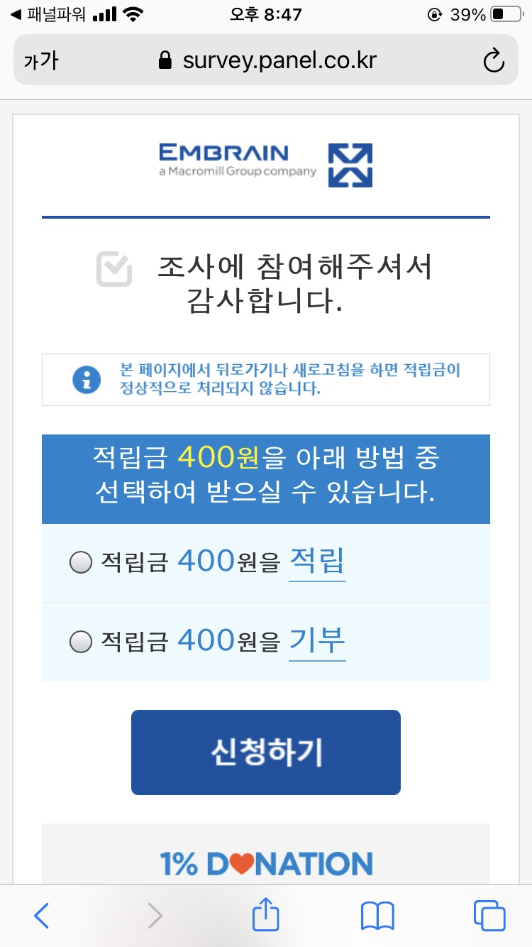 패널나우는 설문을 마치면, 해당 적립금을 적립할 것인지 아니면 기부할 것인지에 대해 여부를 묻습니다. 원하시는 선택지를 골라 신청하시면 되겠습니다. 그리고 프로필조사를 마치시고 나서 3개의 설문이 더 기다리고 있습니다.