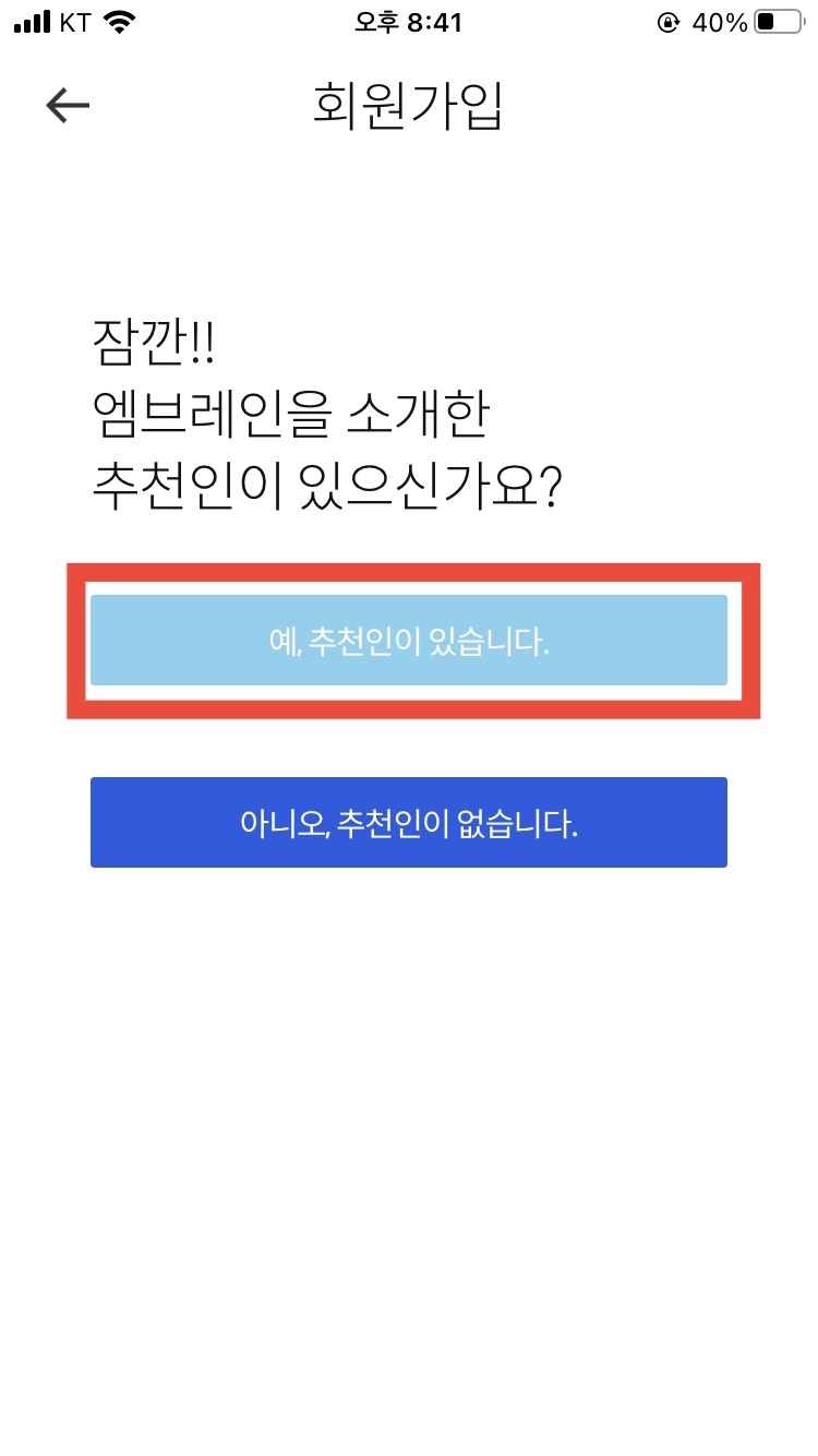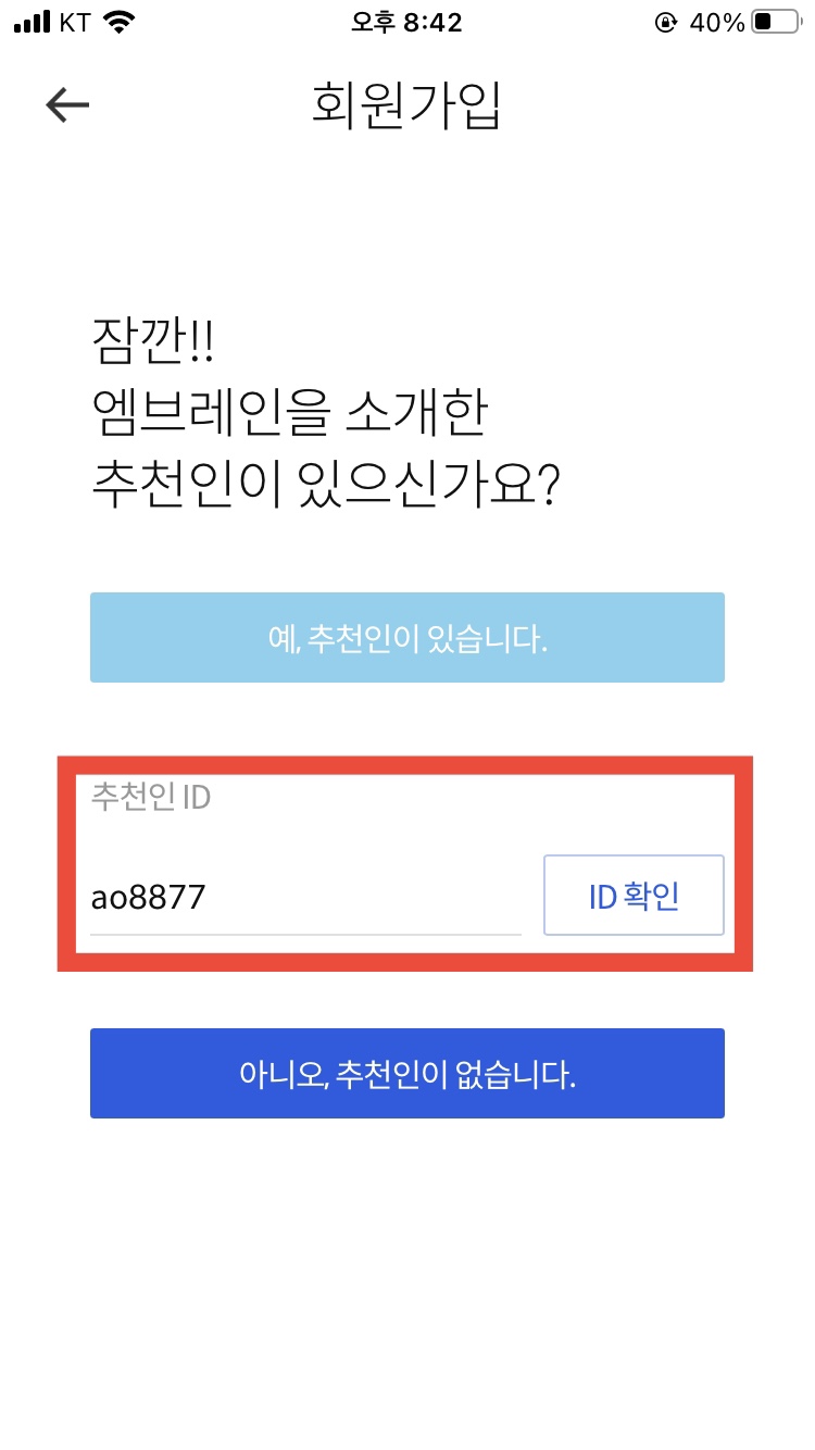 추천인 ID는 지금 입력하지 않으면 다시는 입력하실 수 없기 때문에 꼭 입력하시고 넘어가셔야 합니다.