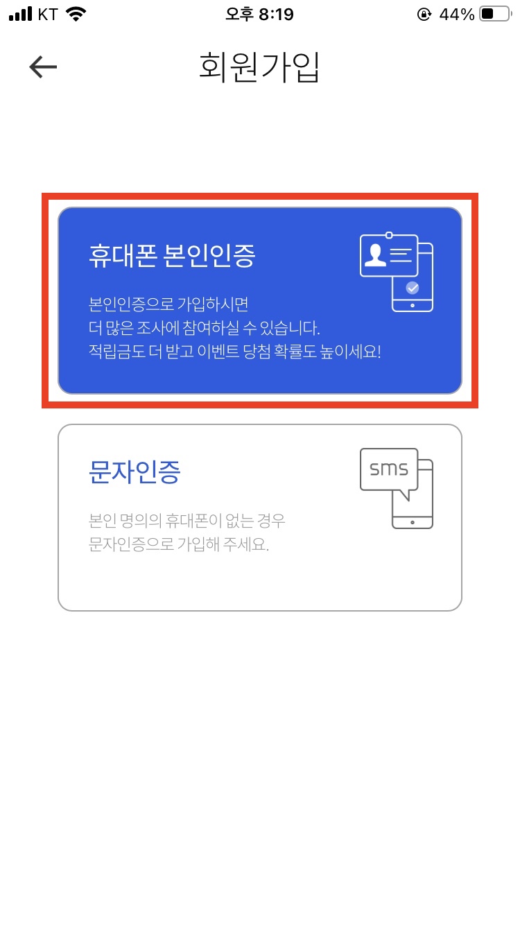 그리고 아래의 '시작하기'를 누른 다음, '회원가입 하기' ➞ '휴대폰 본인인증'으로 넘어갑니다.