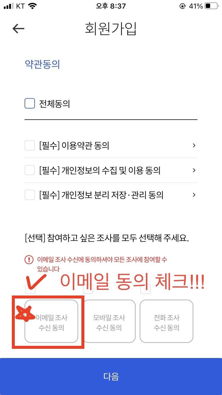 회원가입을 하실 때 주의하실 점이 있습니다. 바로 '이메일 조사 수신 동의'를 꼭 체크하고 넘어가야한다는 것입니다. 이메일 조사 수신에 동의하셔야 모든 조사에 참여하실 수 있기 때문입니다.