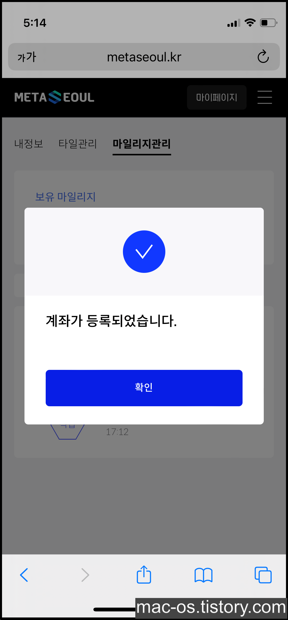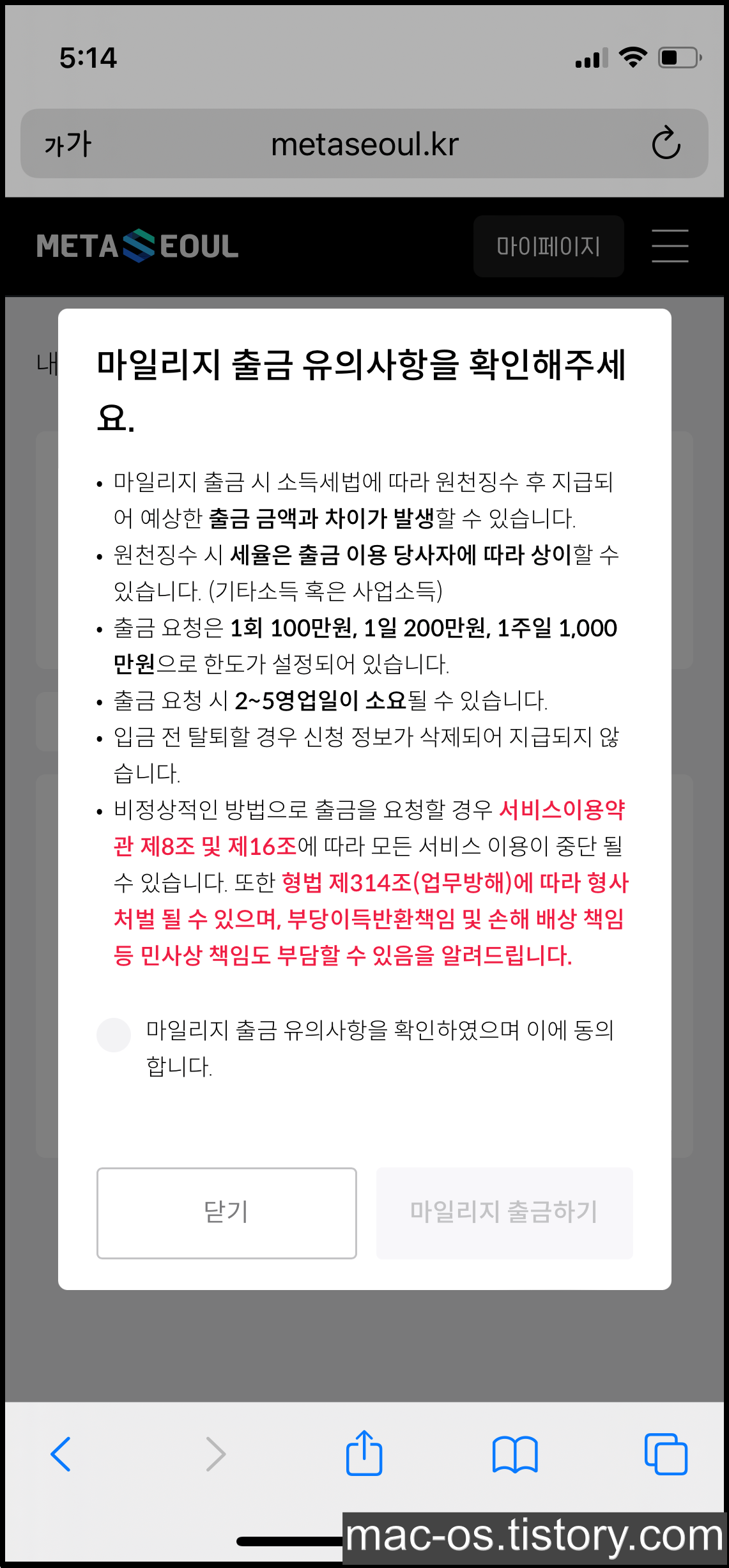 계좌 등록을 마치면 마일리지 출금 유의사항이 뜹니다. 확인하고 [마일리지 출금하기]를 누르면 오른쪽과 같은 화면이 나타납니다.