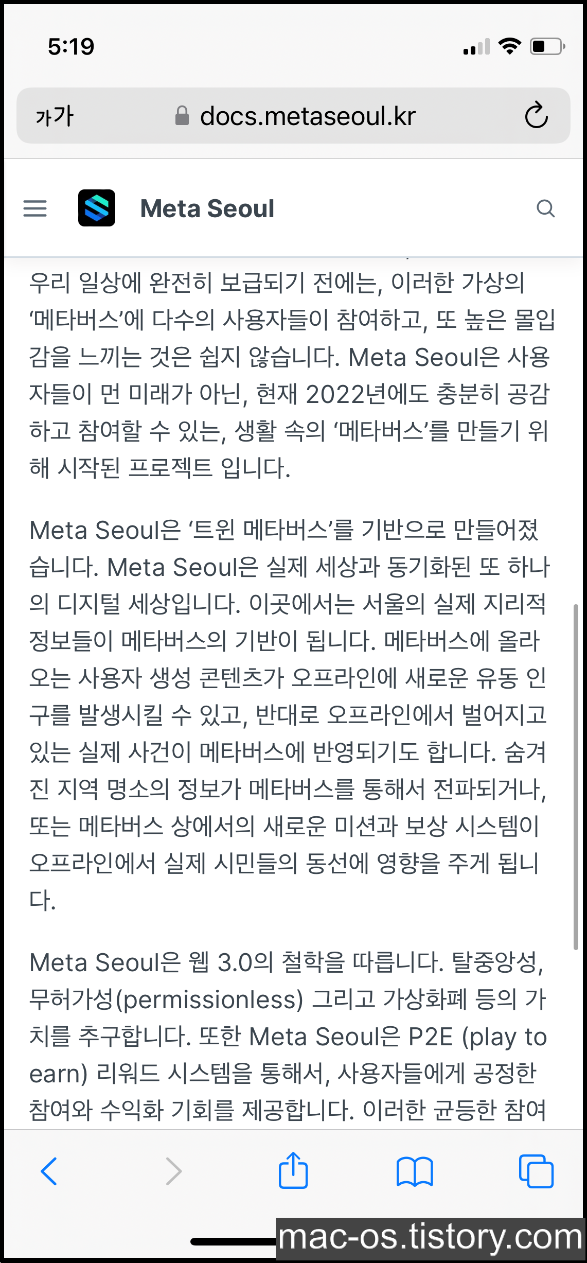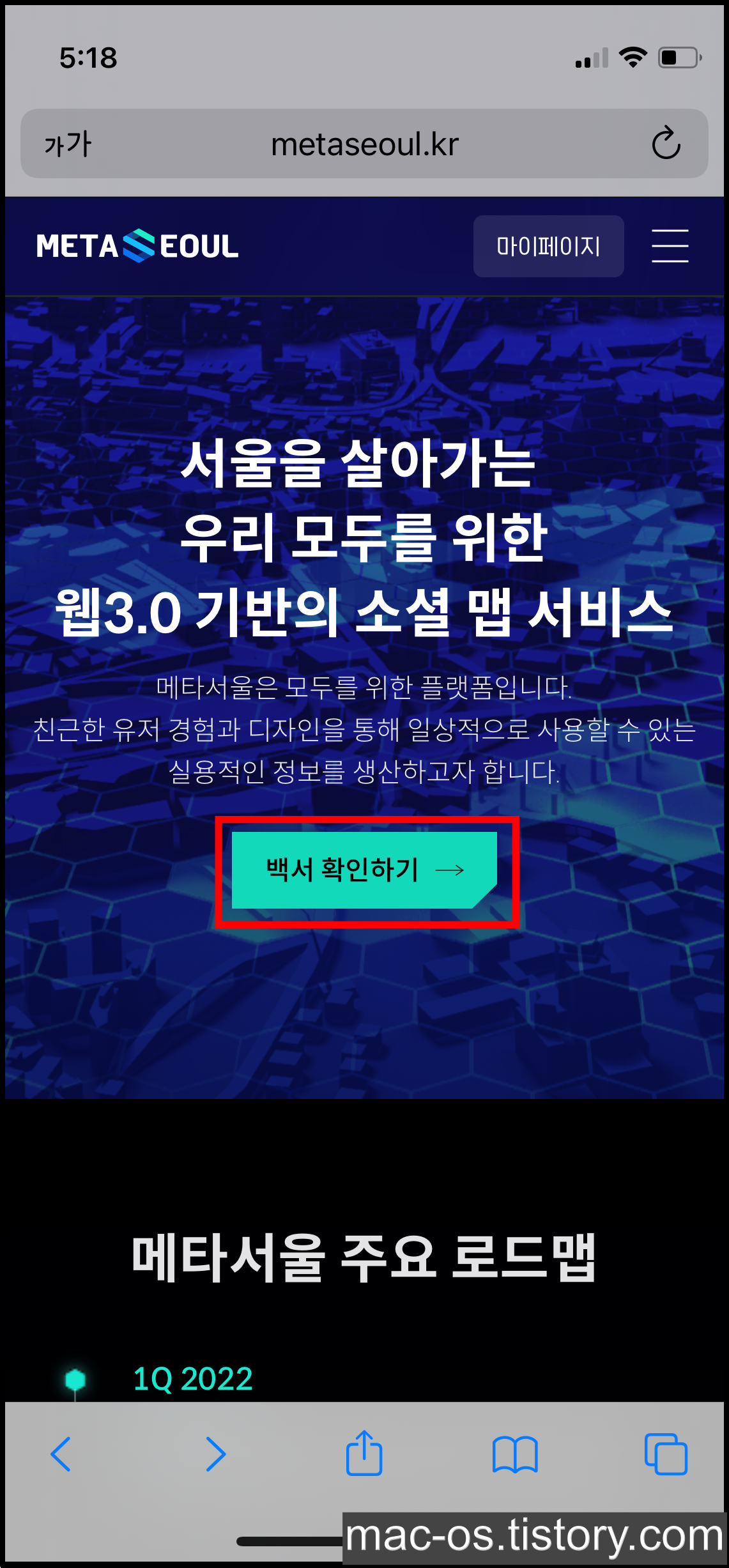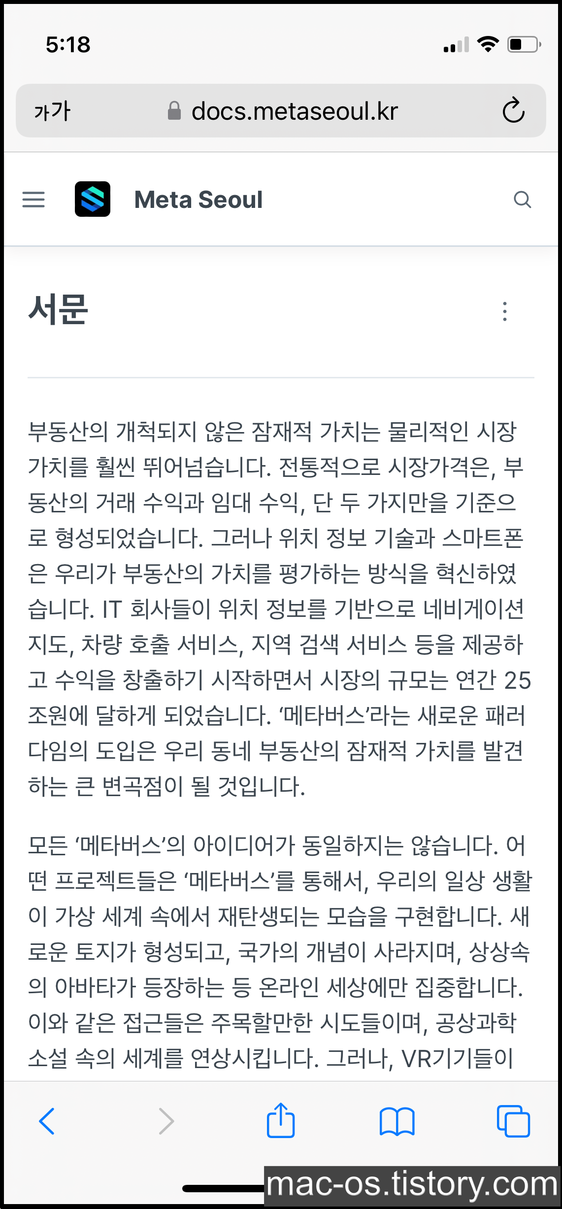 홈 화면에서 [백서 확인하기]를 누르면 메타서울 백서 페이지로 이동하게 됩니다. 서문을 대충 요약해보면