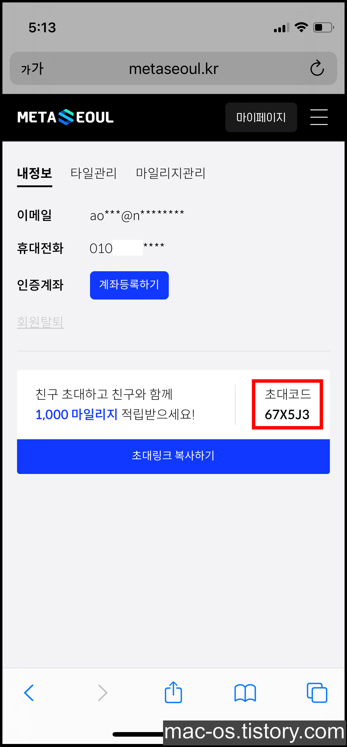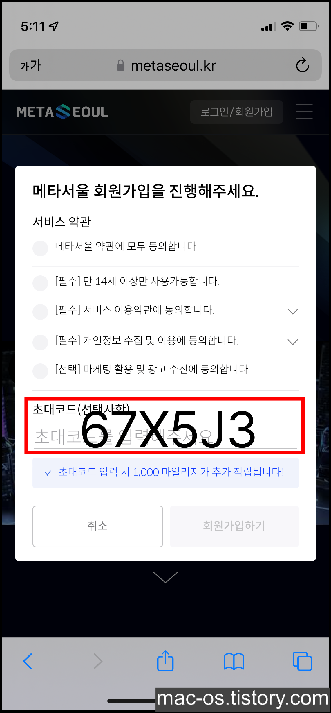 3. 가입 페이지에서 초대코드 67X5J3를 입력한다.