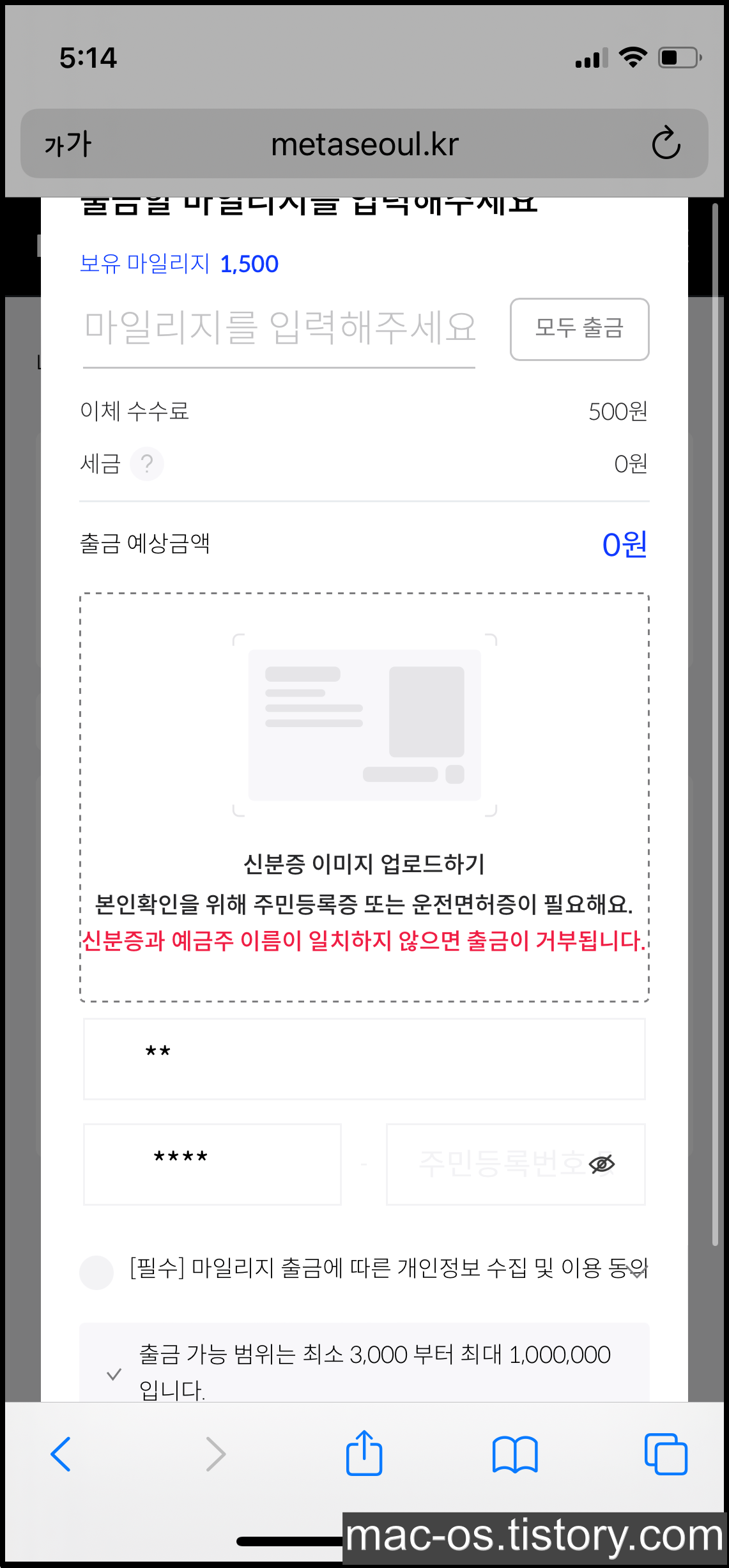 마일리지를 출금하려면 본인확인을 위해 주민등록증 또는 운전면허증의 사진을 업로드해야합니다. 주민등록번호 뒷자리 칸도 있는거보니 가리는 부분 없이 전부 다 보이게 찍어야 되나 봅니다.