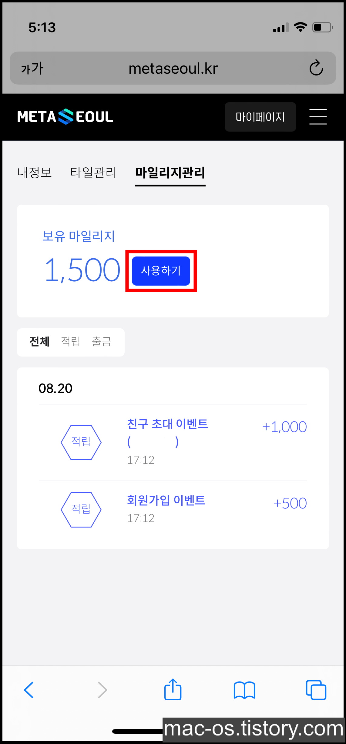 메타서울에서 얻은 마일리지는 현금으로 출금할 수 있는데요. [마이페이지] > [마일리지관리]에서 [사용하기]를 누르면 현금 출금이 가능합니다. 다만 현금을 출금하기 전에 계좌를 등록해야 합니다.