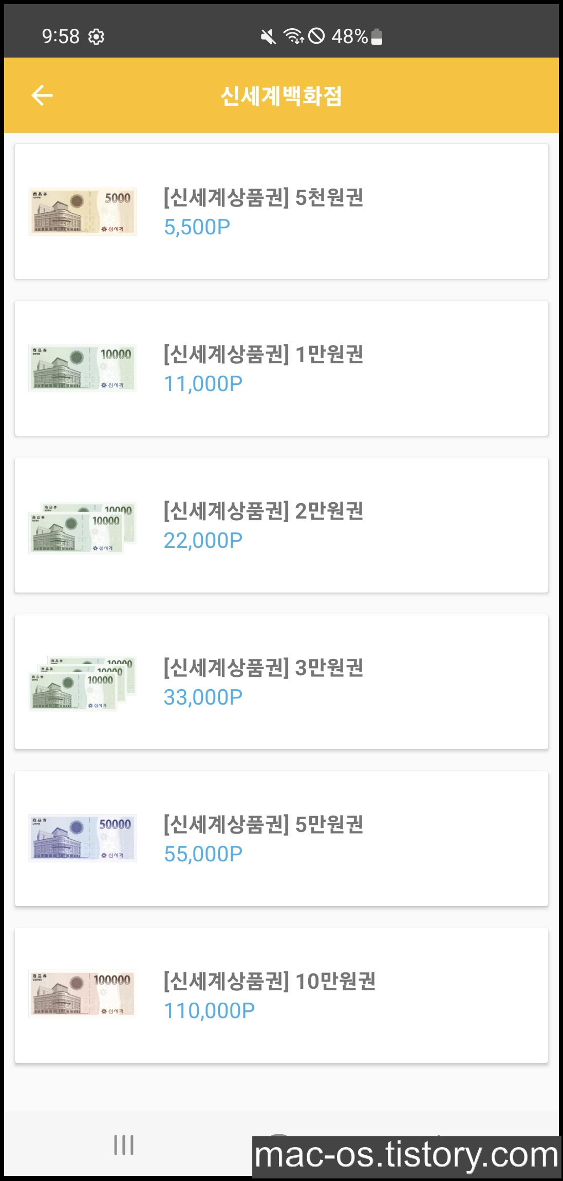 뉴스를 읽고 얻은 포인트는 기프티콘이나 상품권을 구입하는 용도로 사용할 수 있습니다. 현금과 포인트의 비율은 1:1.1로, 신세계 상품권 1만원권을 구매하기 위해선 뉴스돈 플러스 11,000포인트가 필요합니다.