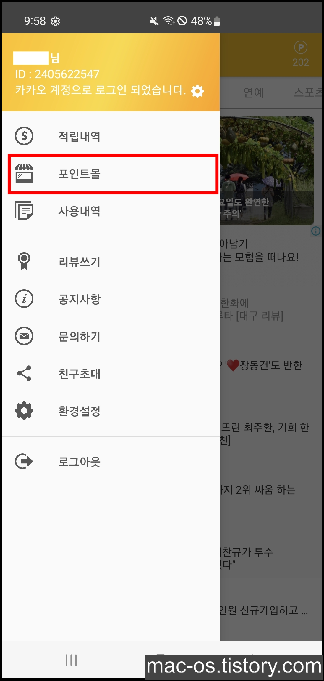 회원가입을 막 마쳤다면 100P만 있을텐데요. 좌측 상단의 더보기 메뉴를 눌러봅시다.