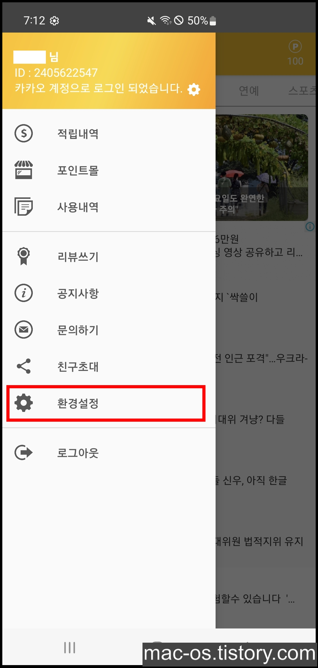 3. 좌측 상단 더보기 메뉴를 누르고 [환경설정] 터치하기