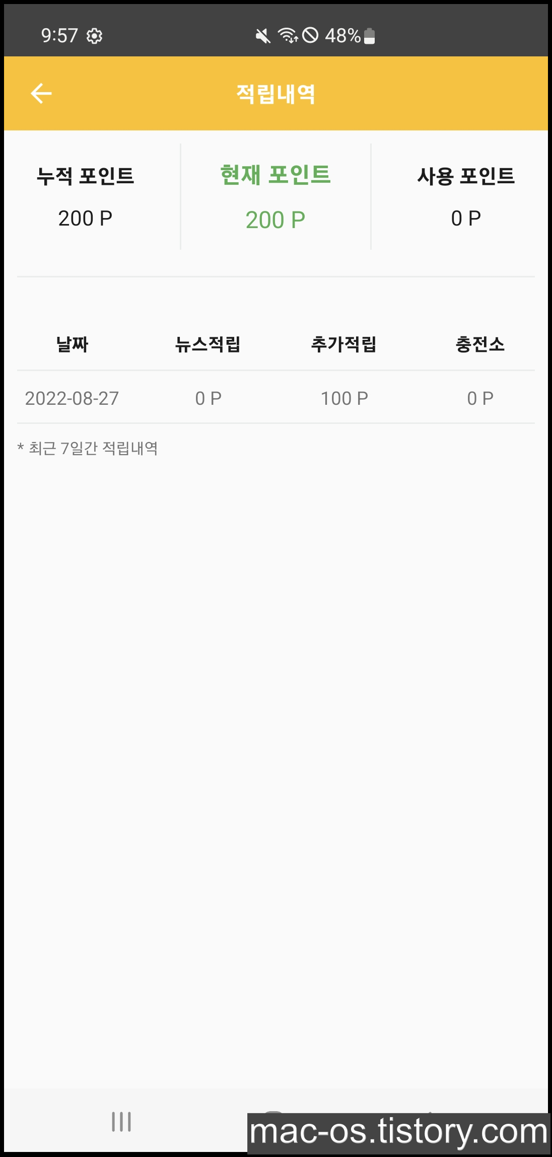 회원가입 보상 100P와 추천인 등록 보상 100P를 받아 총 200P가 되었습니다.
