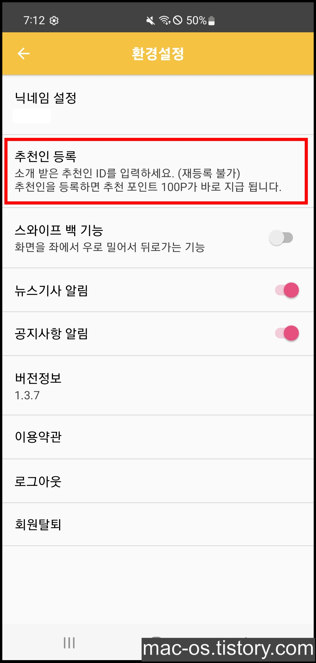 4. 환경설정 페이지에서 [추천인 등록] 터치하기
