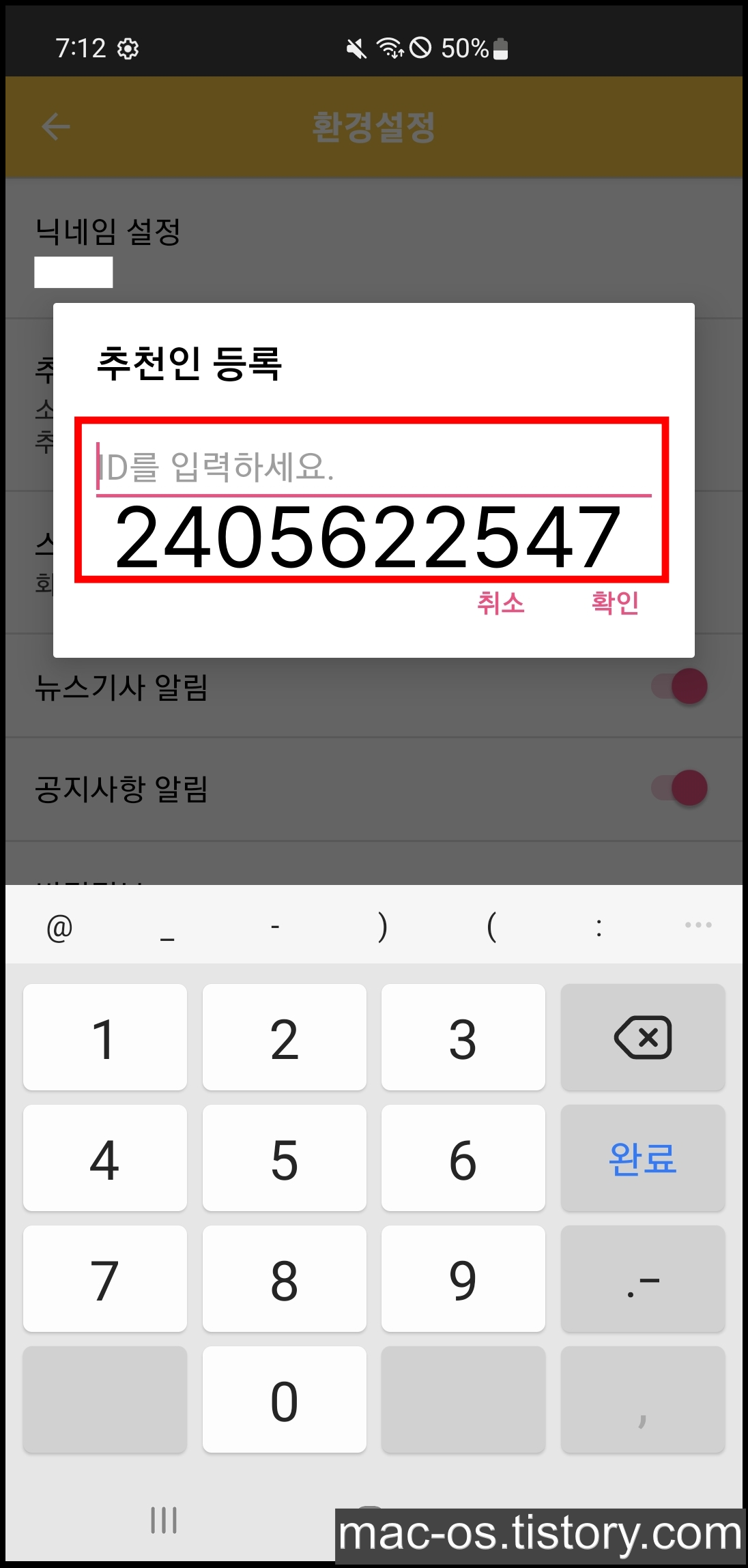 5. 추천인 등록 창에서 2405622547 붙여넣기
