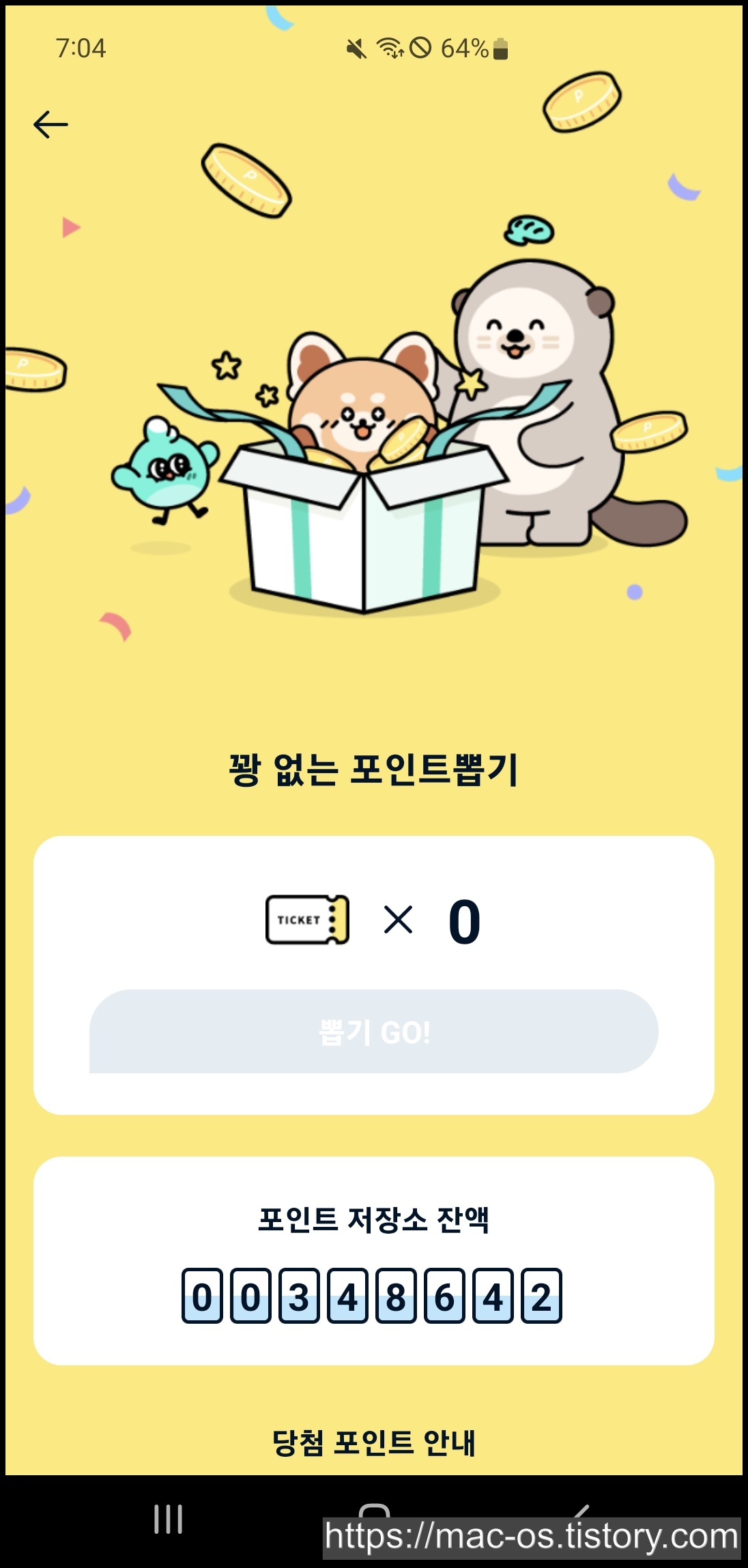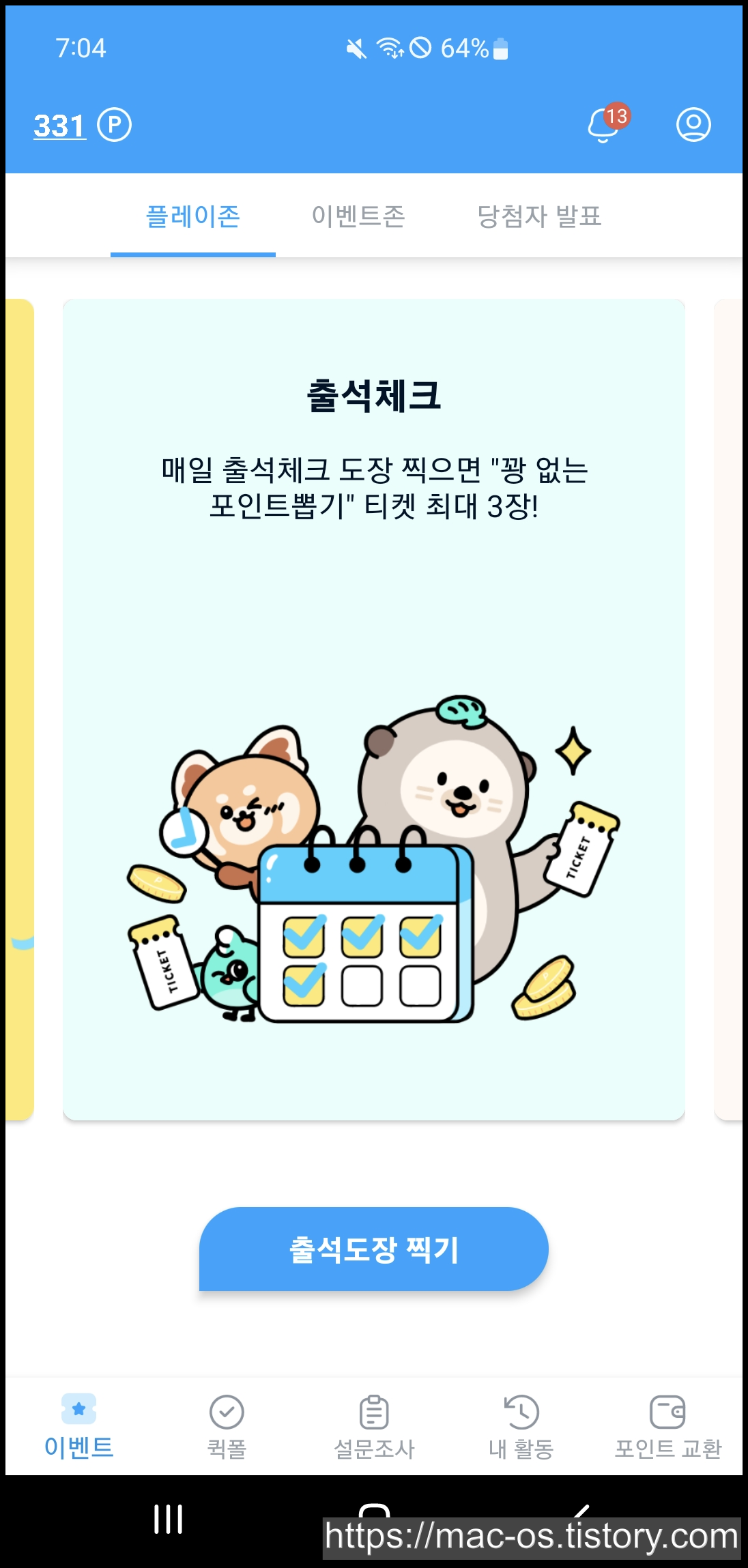 출석체크 도장 10개를 모을 때마다, 꽝 없는 포인트뽑기를 할 수 있는 티켓 1장이 발급된다. 발급받은 티켓은 꽝 없는 포인트 뽑기 메뉴에서 포인트를 추첨하여 적립 받을 수 있다.