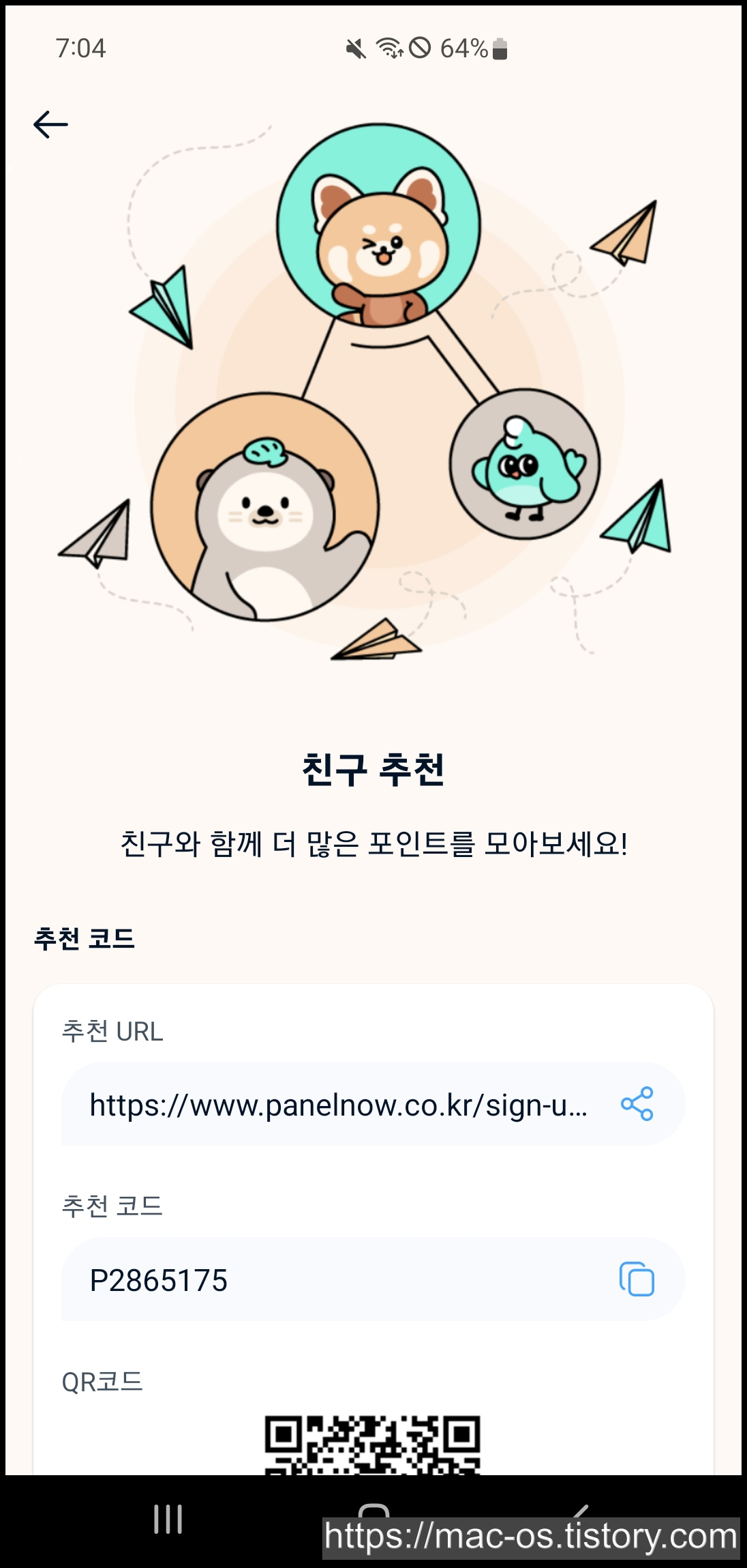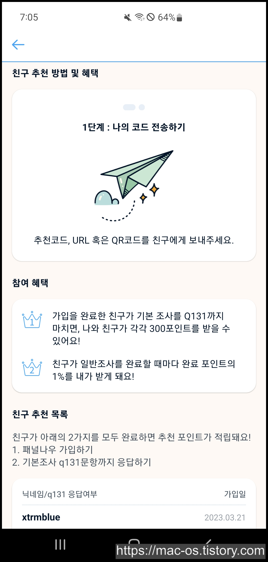 추천코드, URL 혹은 QR코드를 친구에게 보낸다. 친구가 해당 추천코드를 입력하고 가입을 완료한 다음 기본 조사를 Q131까지 마치면 친구와 초대자 모두에게 300포인트를 지급한다.