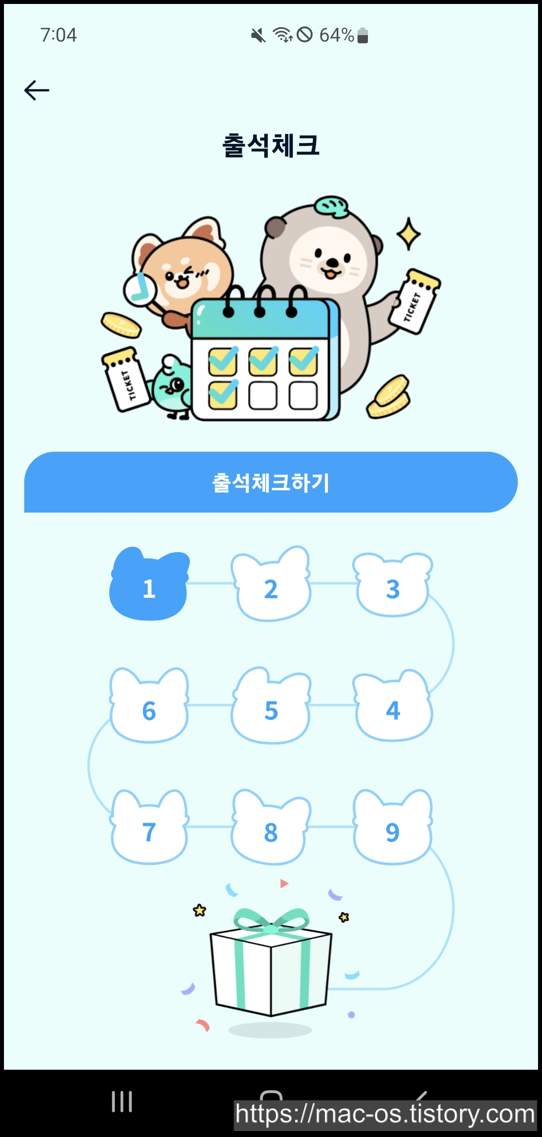 출석체크하기 버튼을 눌러야만 출석이 인정된다. 출석체크는 하루에 1번만 가능하며, 매일 연속 출석하지 않아도 기록은 저장된다. 출석체크 기록은 꽝 없는 포인트뽑기 티켓이 발급되면 다시 리셋된다.