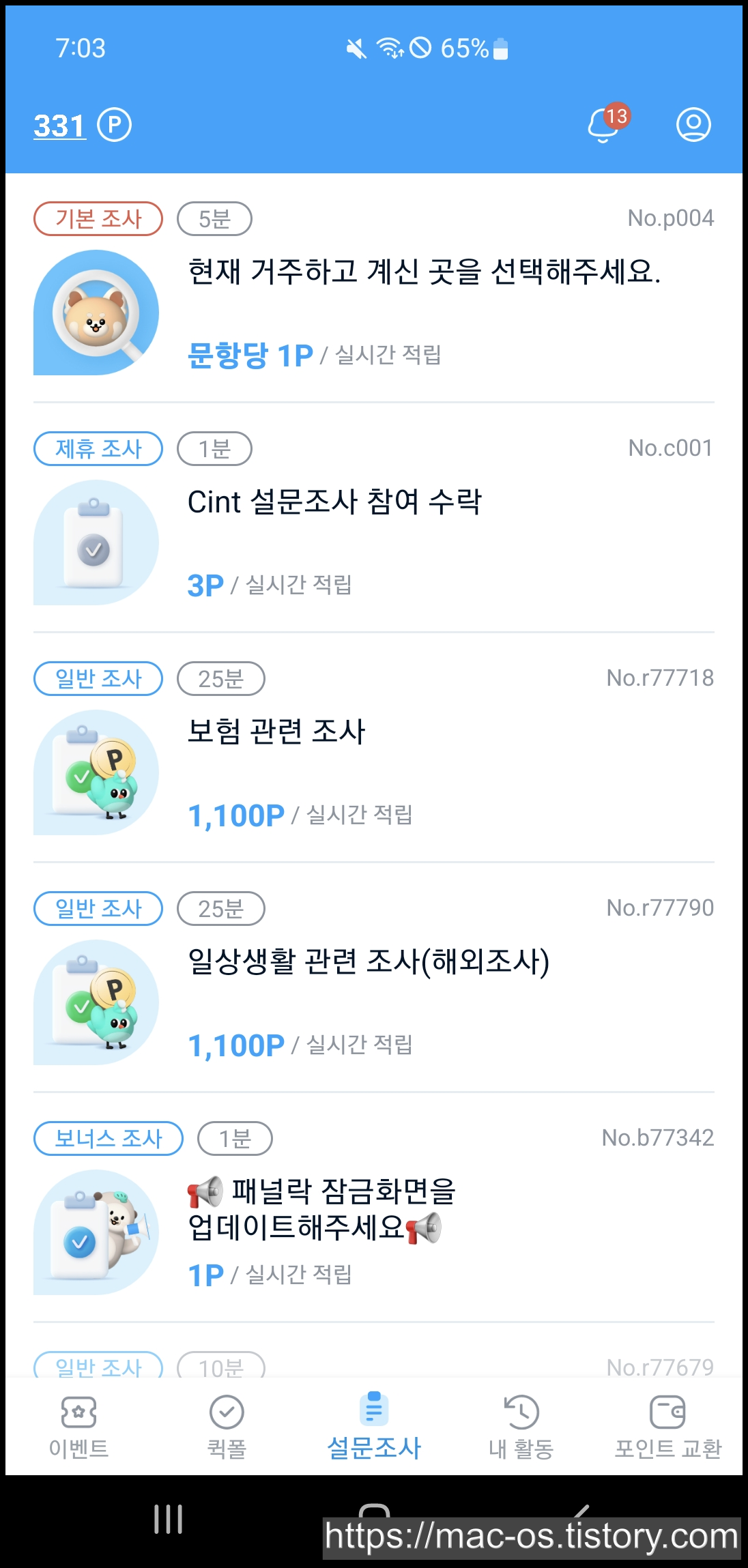 이런 설문조사 앱은 중요한 게 있는데 바로 '기본 조사'다. 기본 조사를 먼저 참여해야 여러 설문 조사가 많이 들어온다. 이렇게 설문조사 탭에서 자신이 참여할 수 있는 설문을 한눈에 확인이 가능하다.