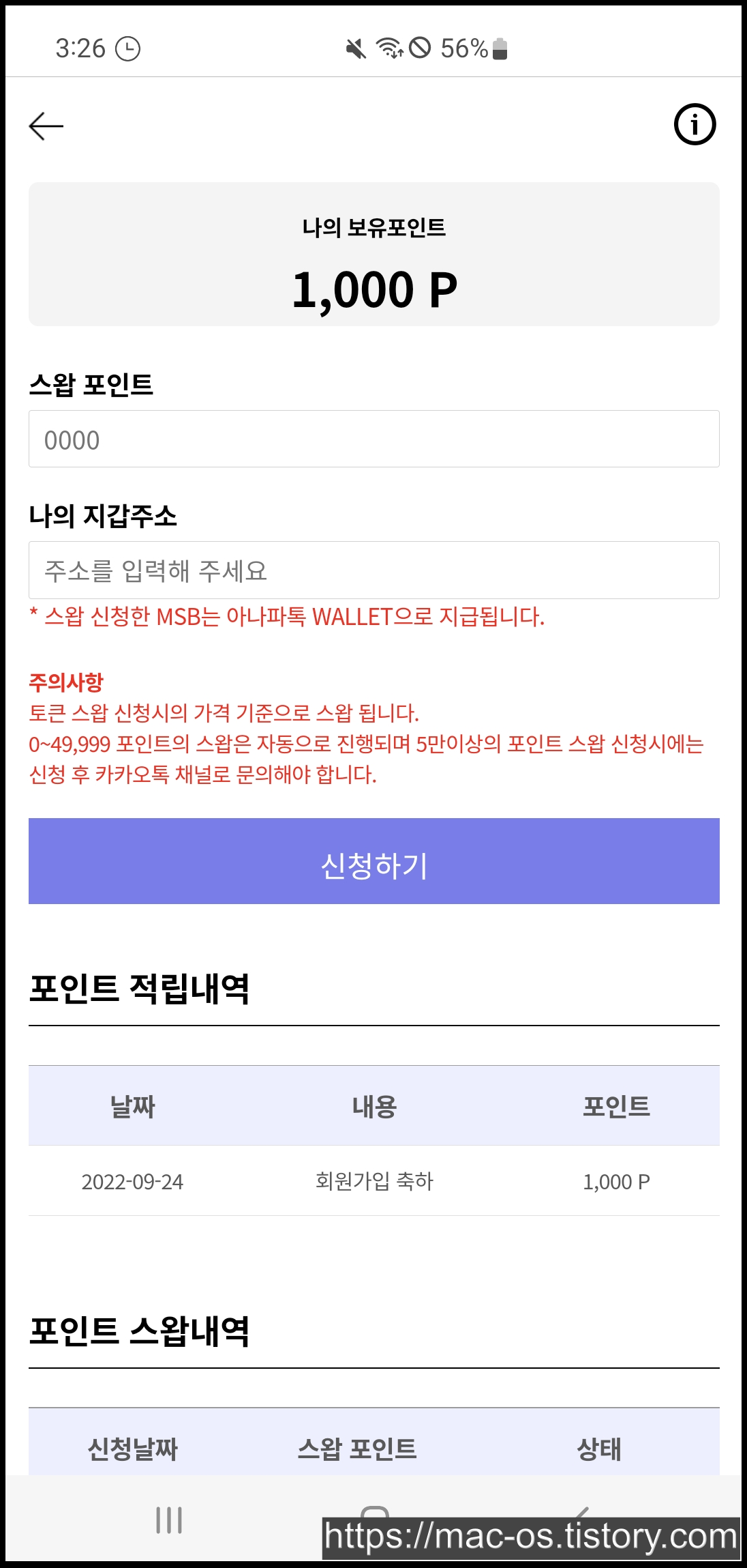 아나파톡에서 신규 회원가입 시 1,000포인트가 지급되는데요. 매일 채굴(출석체크)을 한번 할 때마다 150포인트를 받을 수 있습니다. 포인트는 1만 포인트부터 Misbloc(MSB)로 스왑하여 현금화가 가능합니다.