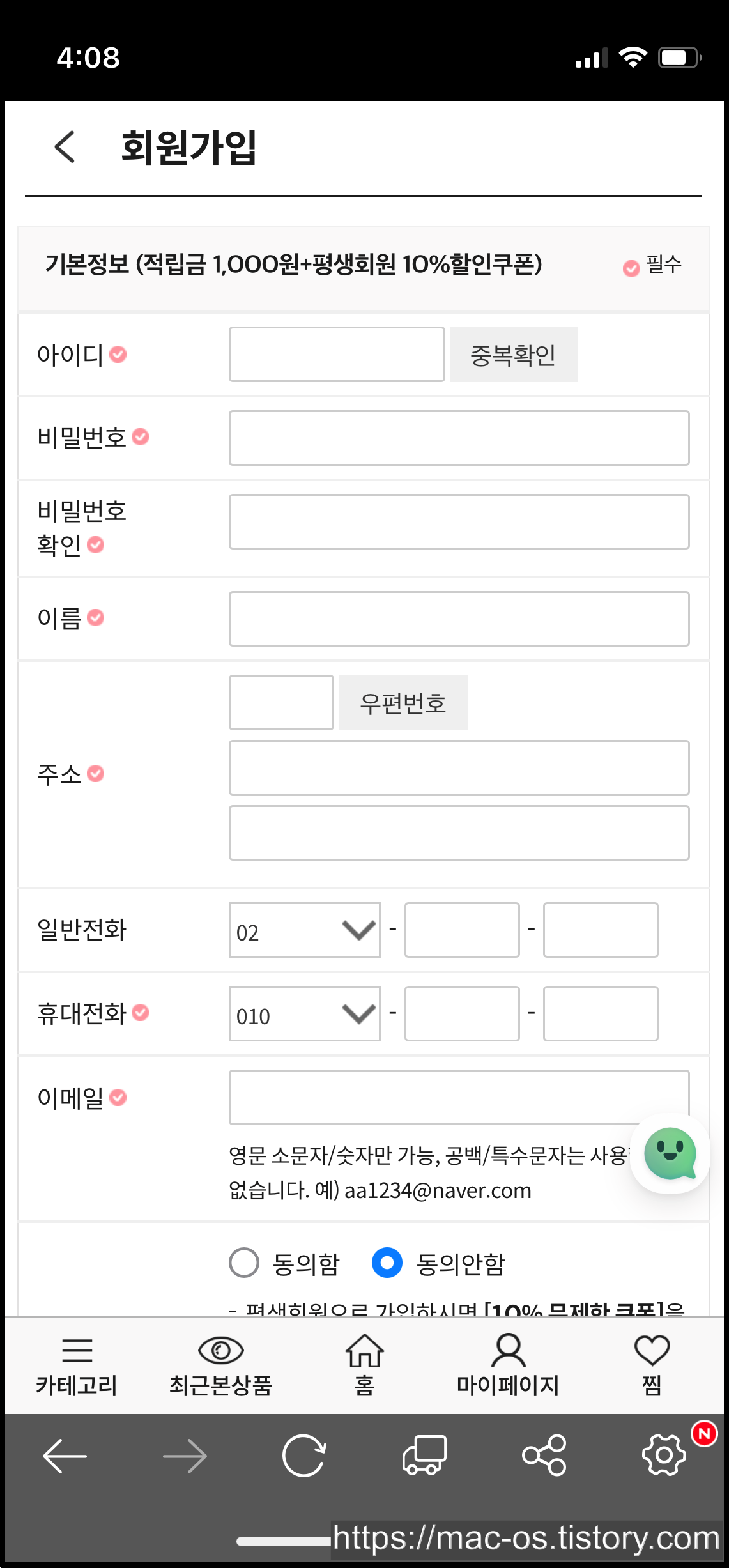 가입 페이지에서 기본정보를 입력합니다. 평생회원 동의 시 10% 무제한 쿠폰을 받을 수 있습니다.
