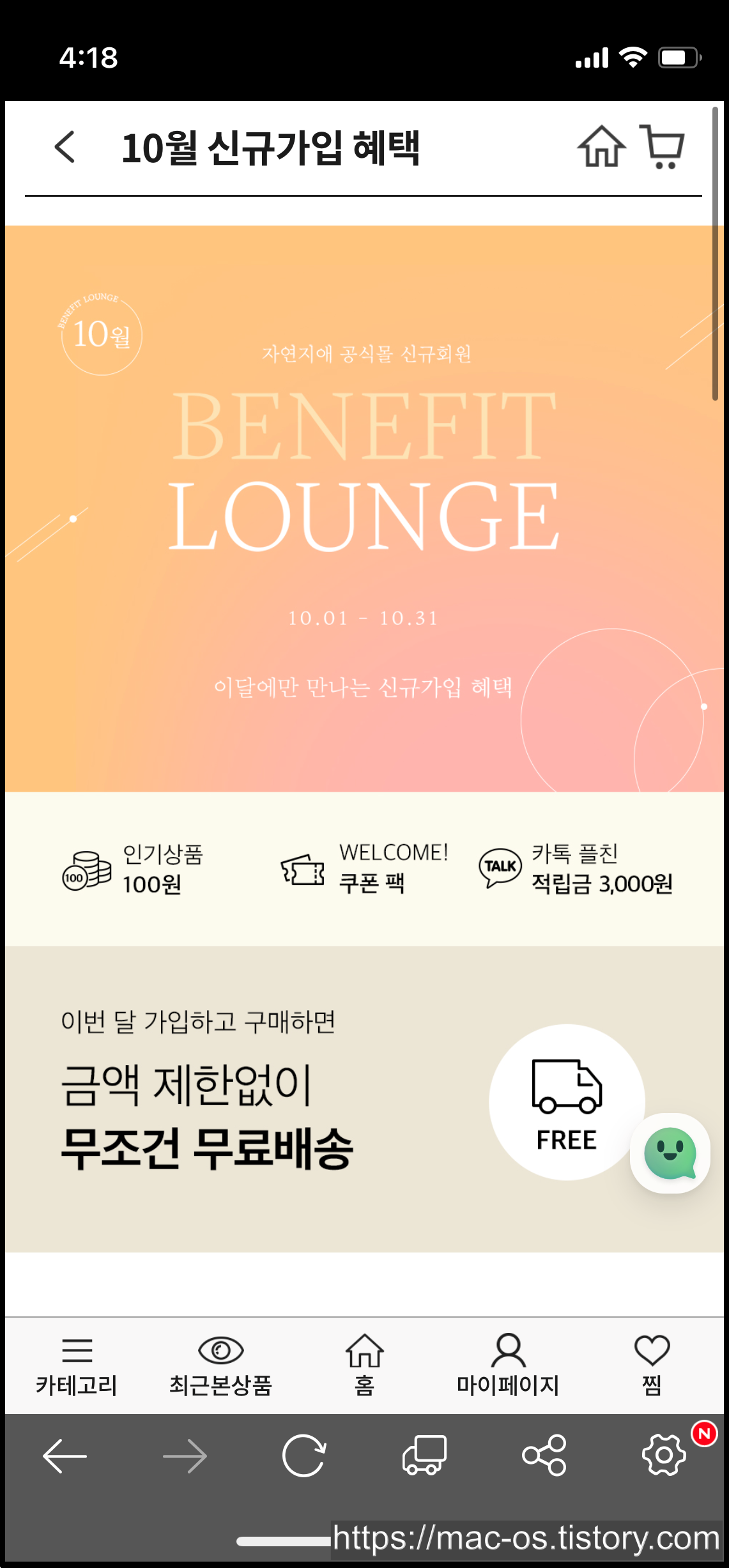 자연지애 10월 혜택을 살펴보겠습니다. 우선 첫 구매 시 오른쪽 사진에 있는 4개의 상품 중 1개를 100원에 구매할 수 있다고 합니다.