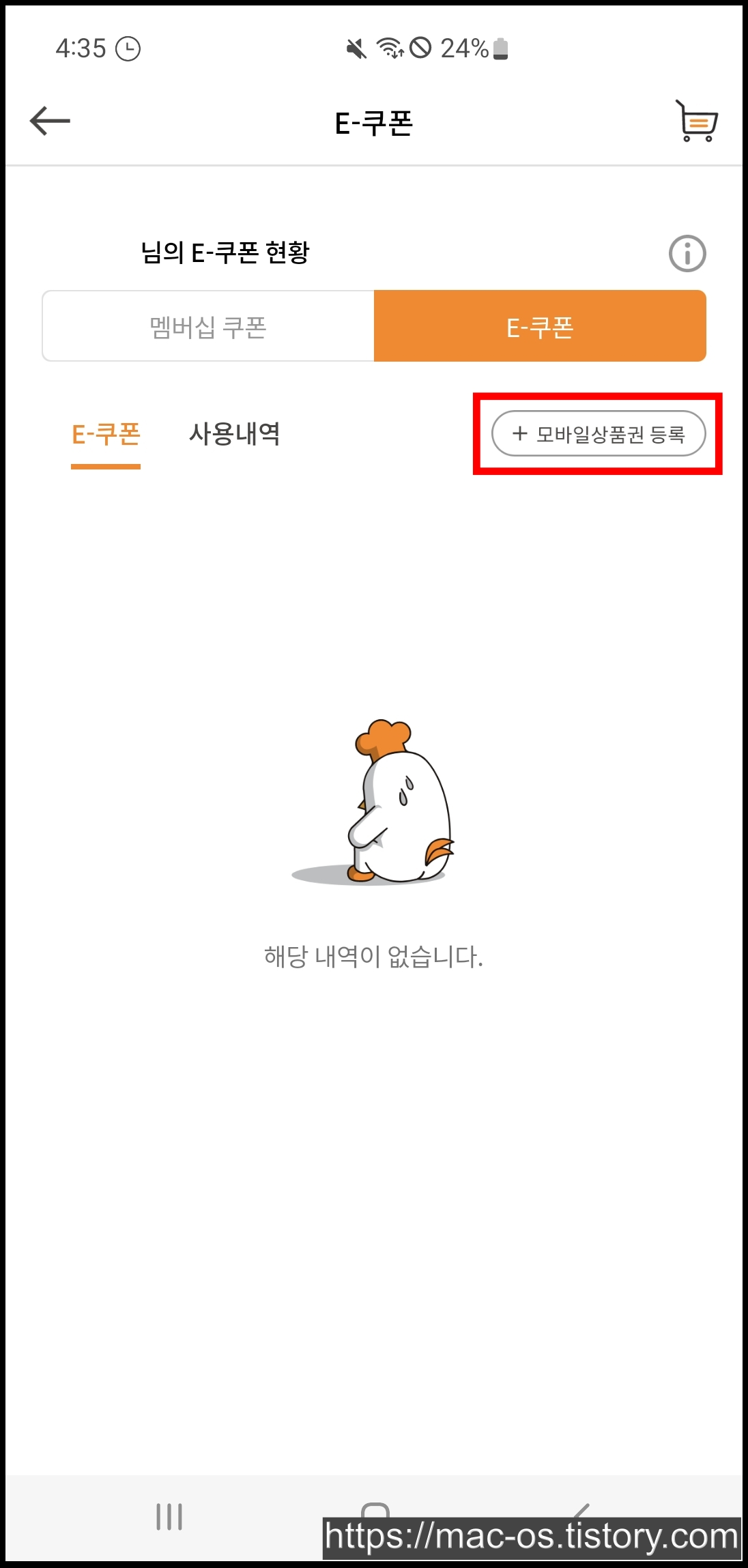 E-쿠폰 등록 페이지에서 선물받은 기프티콘 번호를 입력하고 [등록]을 누르면 해당 기프티콘 상품을 장바구니에 담을 수 있는데요.
