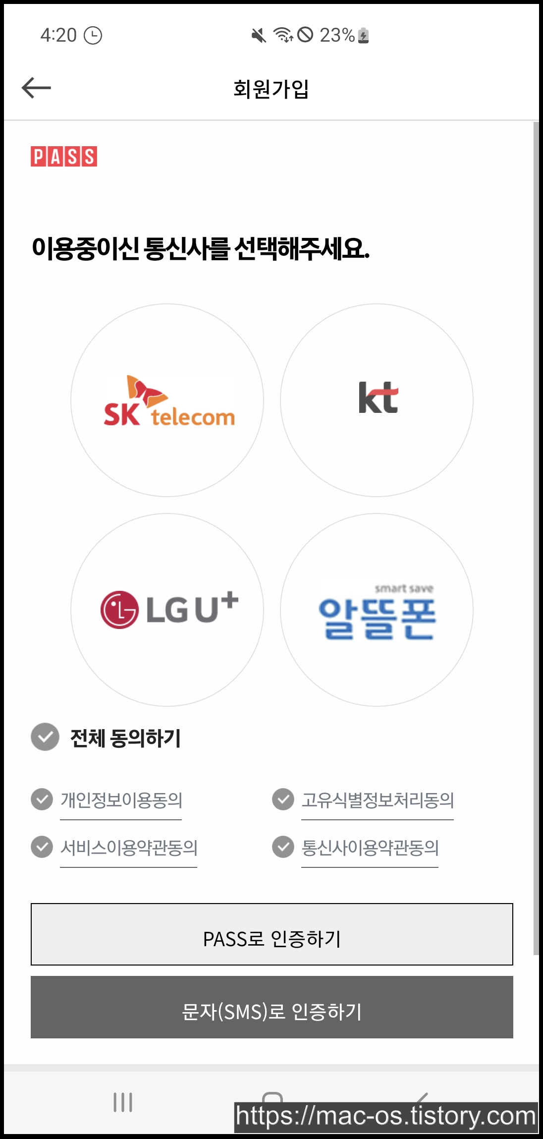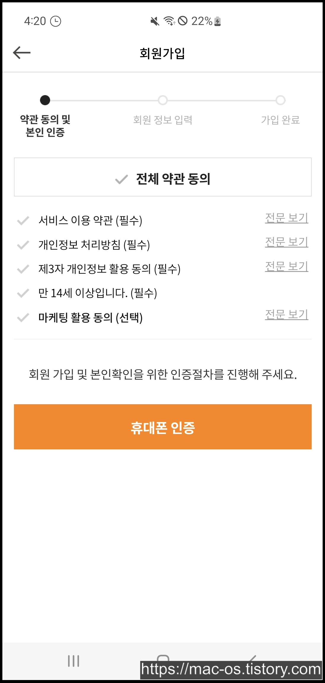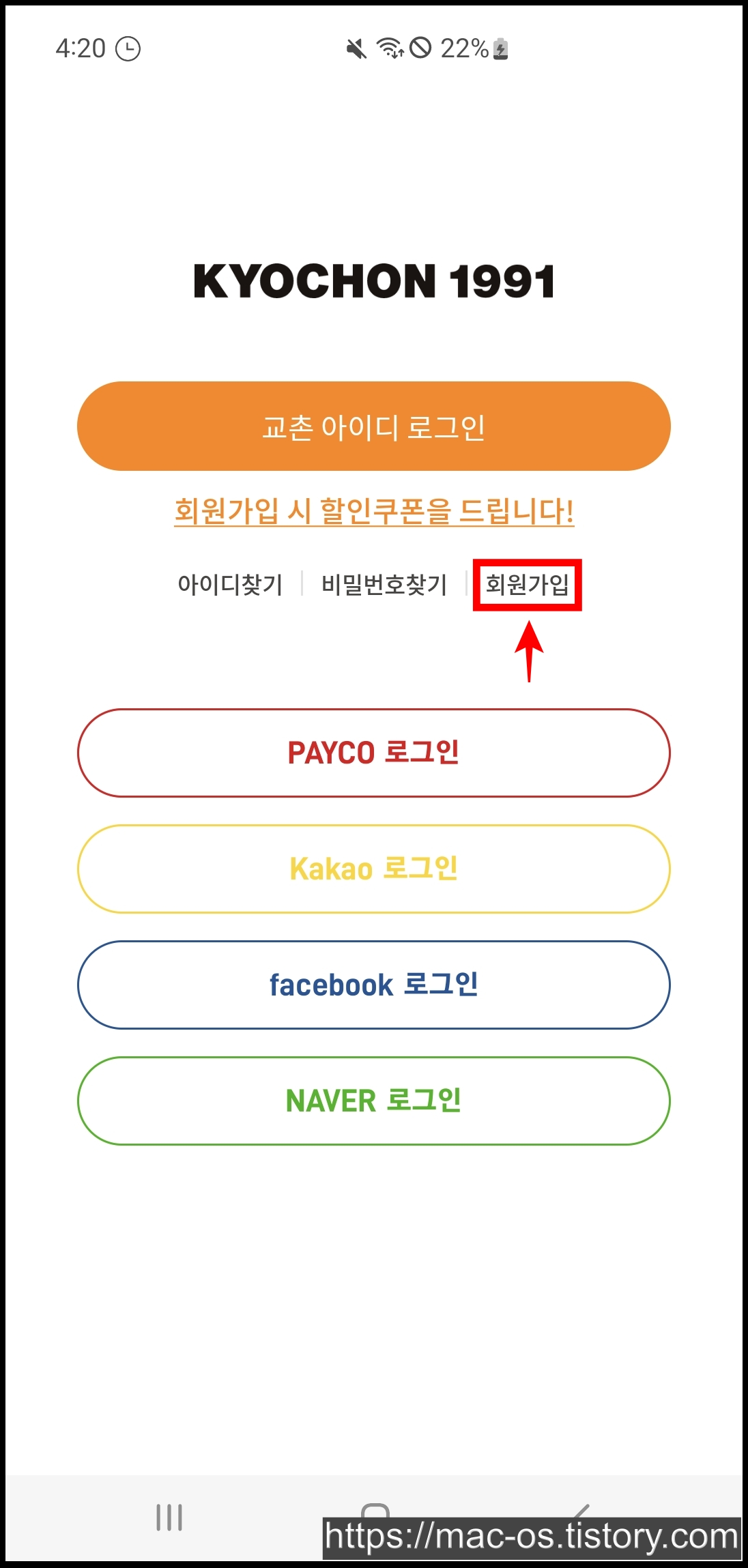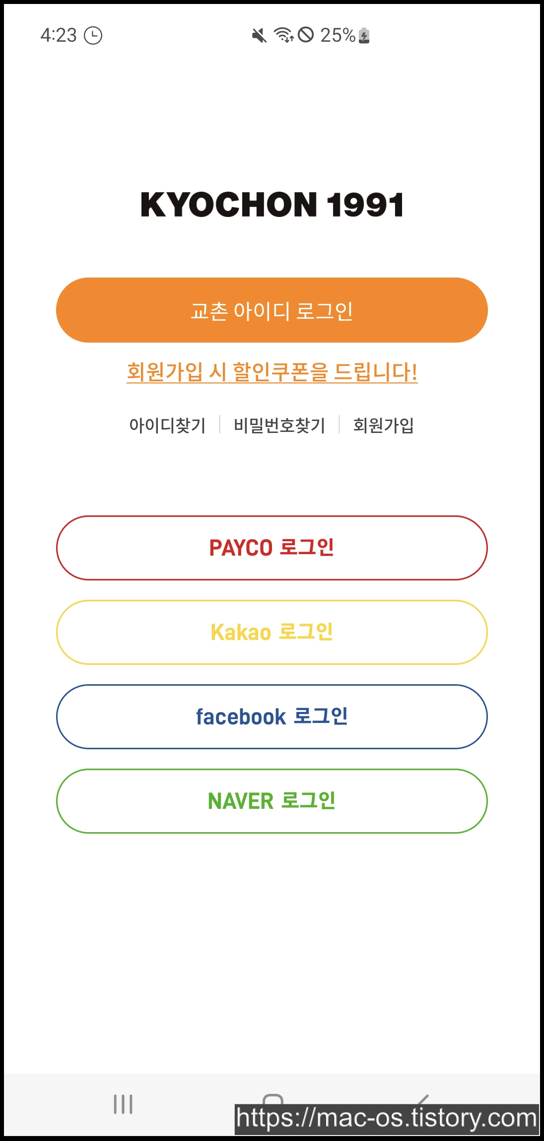 교촌치킨 앱은 페이코, 카카오, 페이스북, 네이버 계정으로 로그인하거나 [회원가입]을 눌러 본인인증으로 가입할 수 있습니다. 약관동의 페이지에서 (필수)를 체크해줍시다.