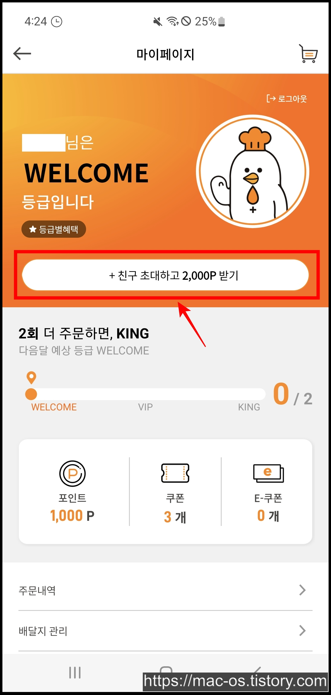 교촌치킨 멤버십은 총 3개의 등급으로 구성되는데요. 월 0회 주문은 WELCOME, 1회 주문은 VIP, 2회 주문은 KING 등급이라고 합니다.