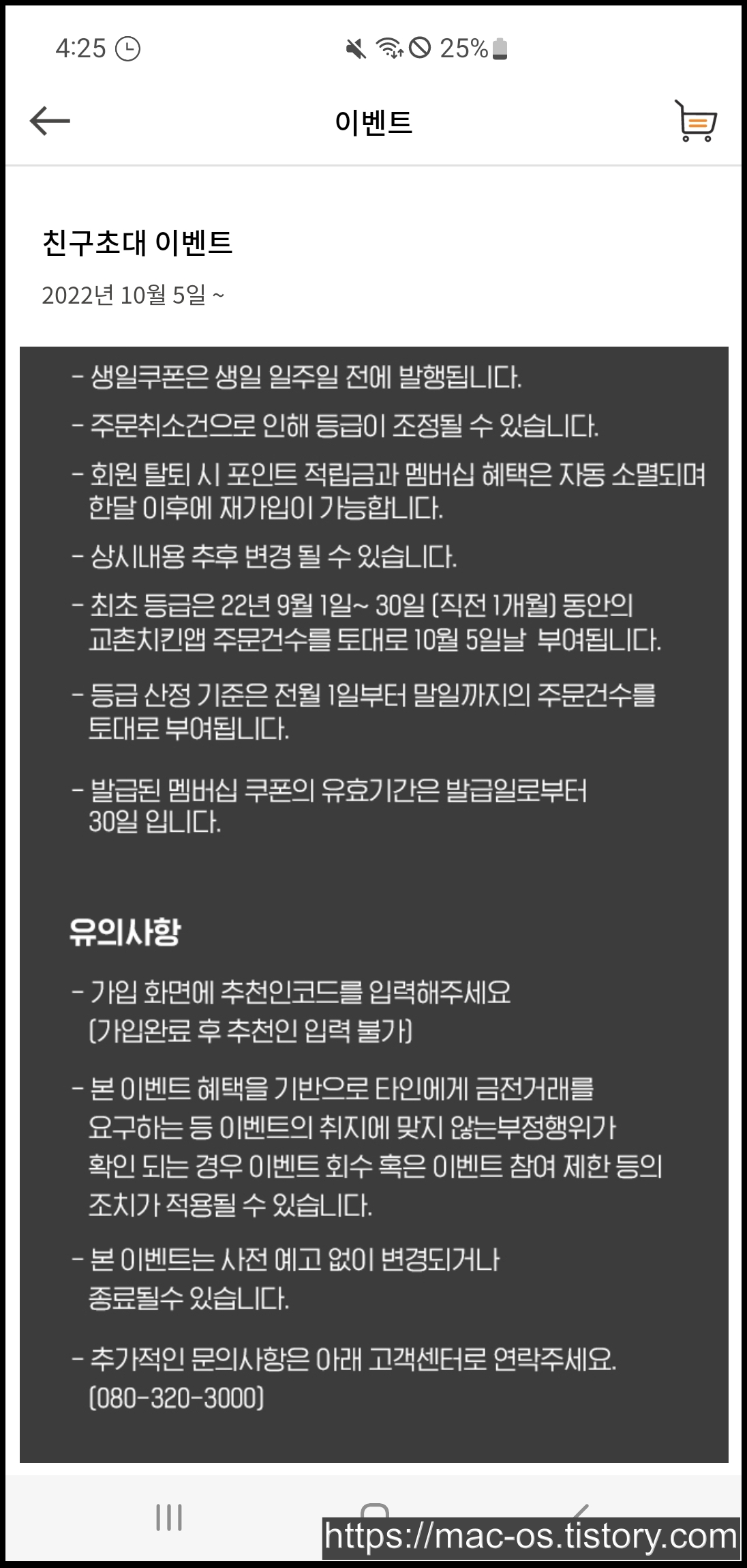 등급 산정 기준은 전월 1일부터 말일까지의 주문건수를 토대로 부여되고, 발급된 멤버십 쿠폰의 유효기간은 발급일로부터 30일입니다. 교촌치킨 멤버십과 친구초대 이벤트 유의사항을 쭉 읽어봤는데, 그렇게 중요한 내용은 없는 듯 하네요.