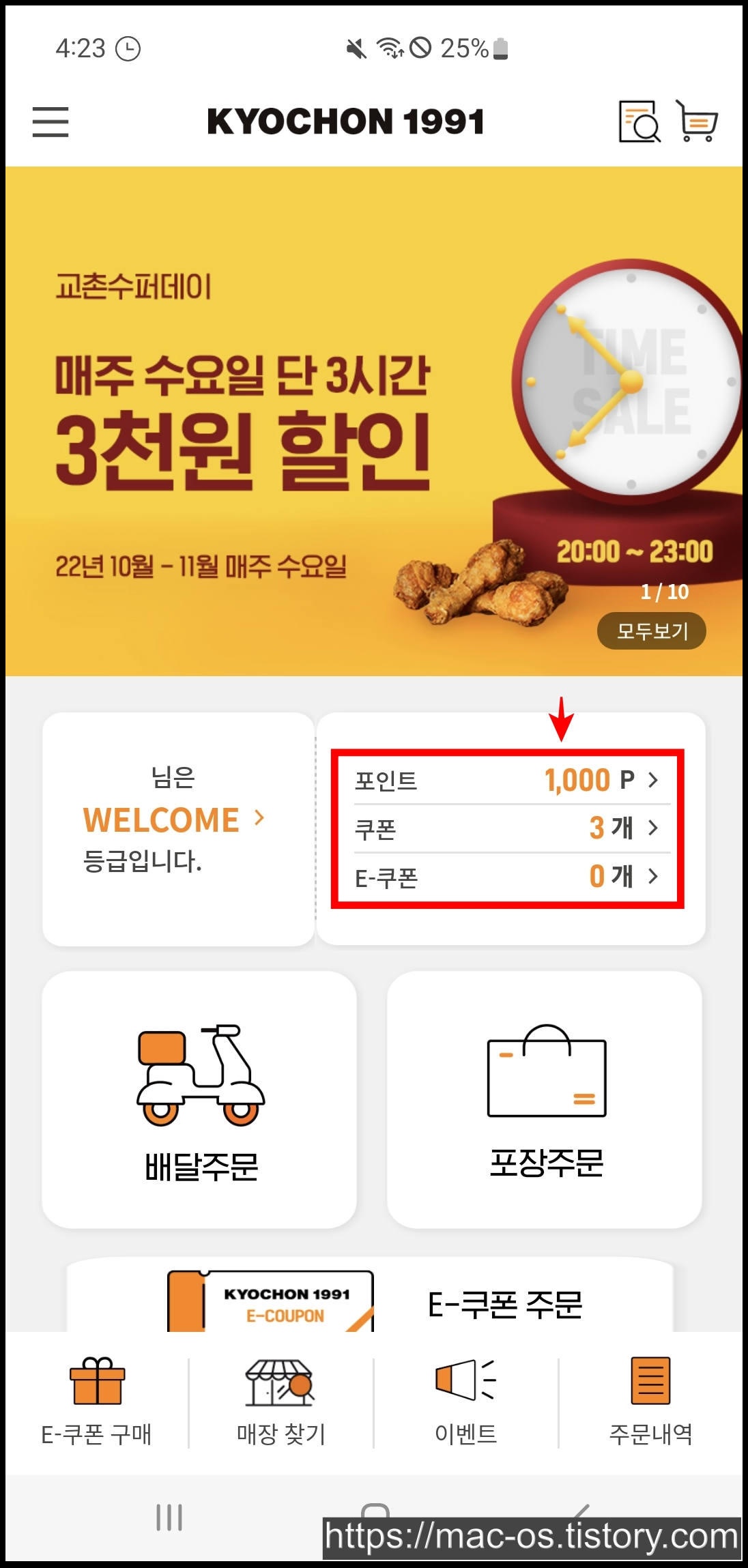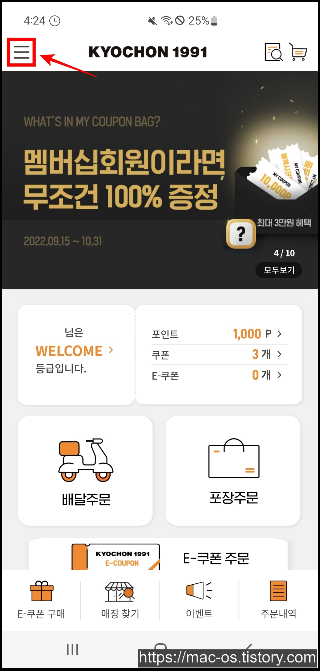 로그인을 하고 나면 1,000P와 쿠폰 3개가 들어온 것을 확인할 수 있는데요.