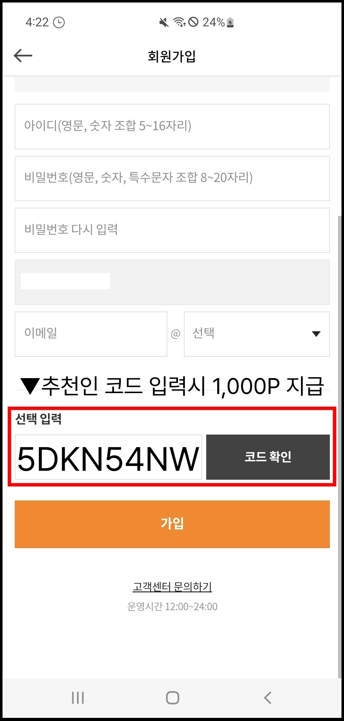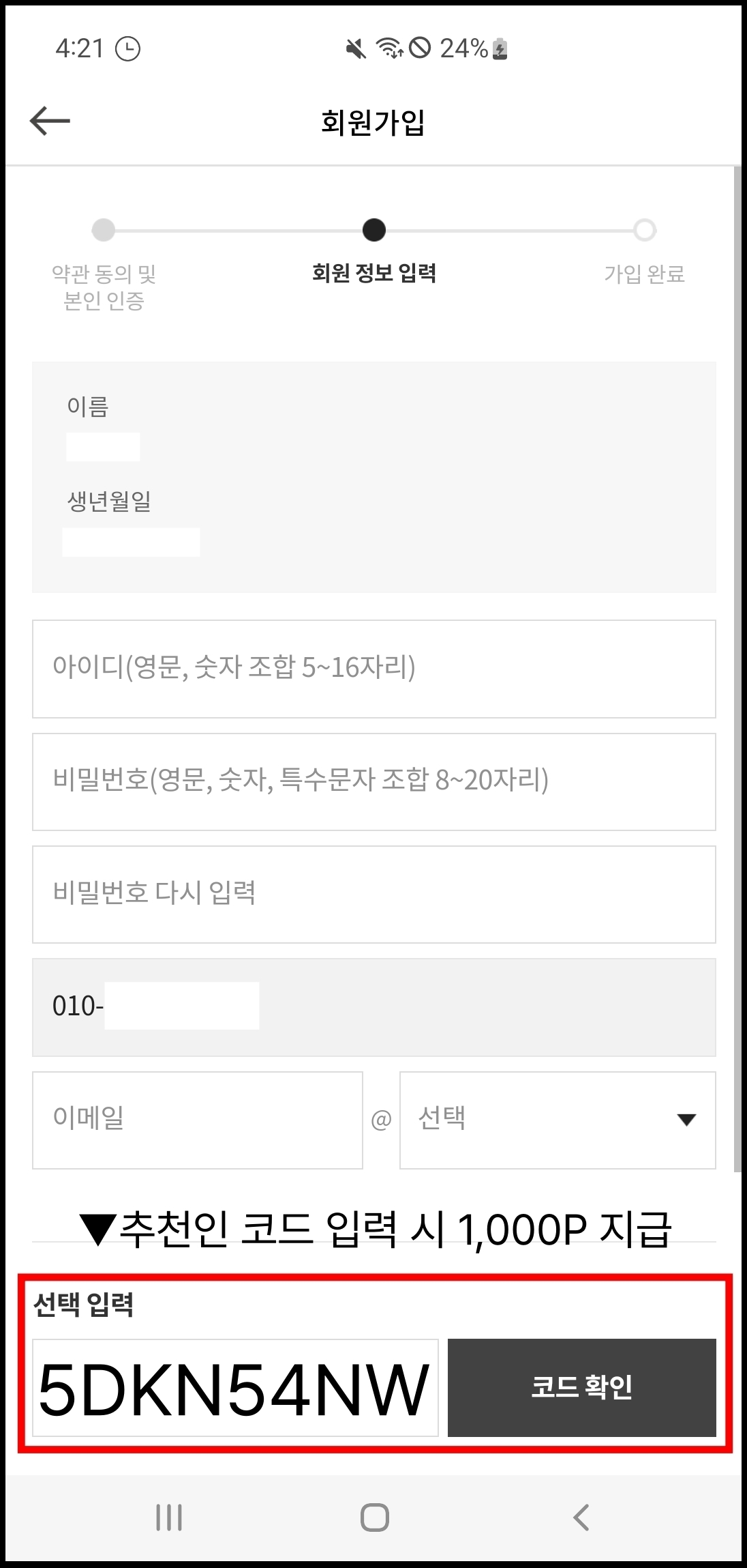 추천인 코드는 회원가입 페이지에서만 입력할 수 있으며, 회원가입이 완료된 이후에는 따로 입력할 수 없으므로 주의하세요.
