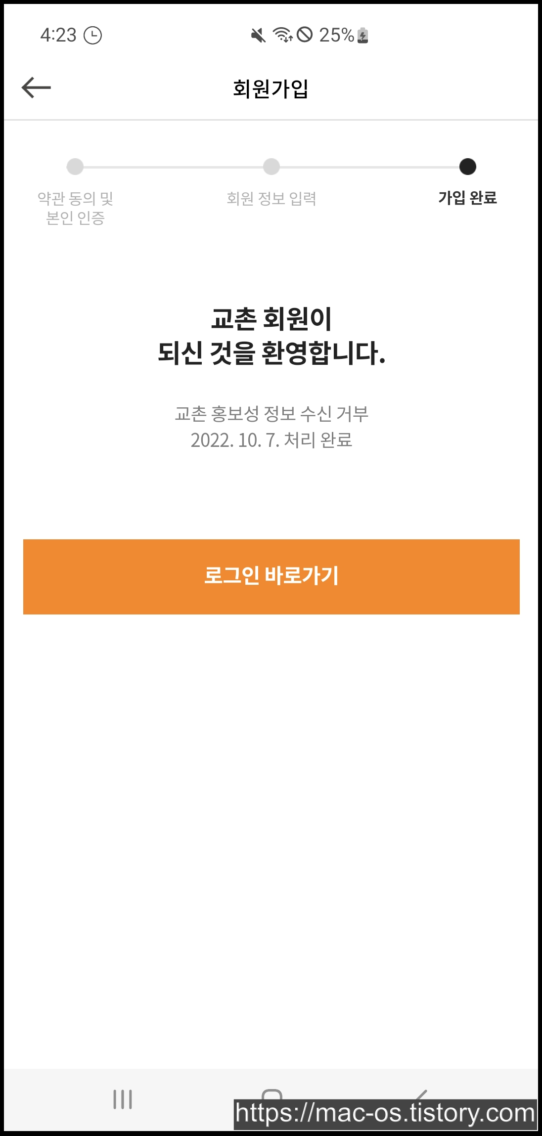 회원정보를 마저 입력하고 [가입] 버튼을 터치하면 교촌치킨 회원가입이 완료됩니다.