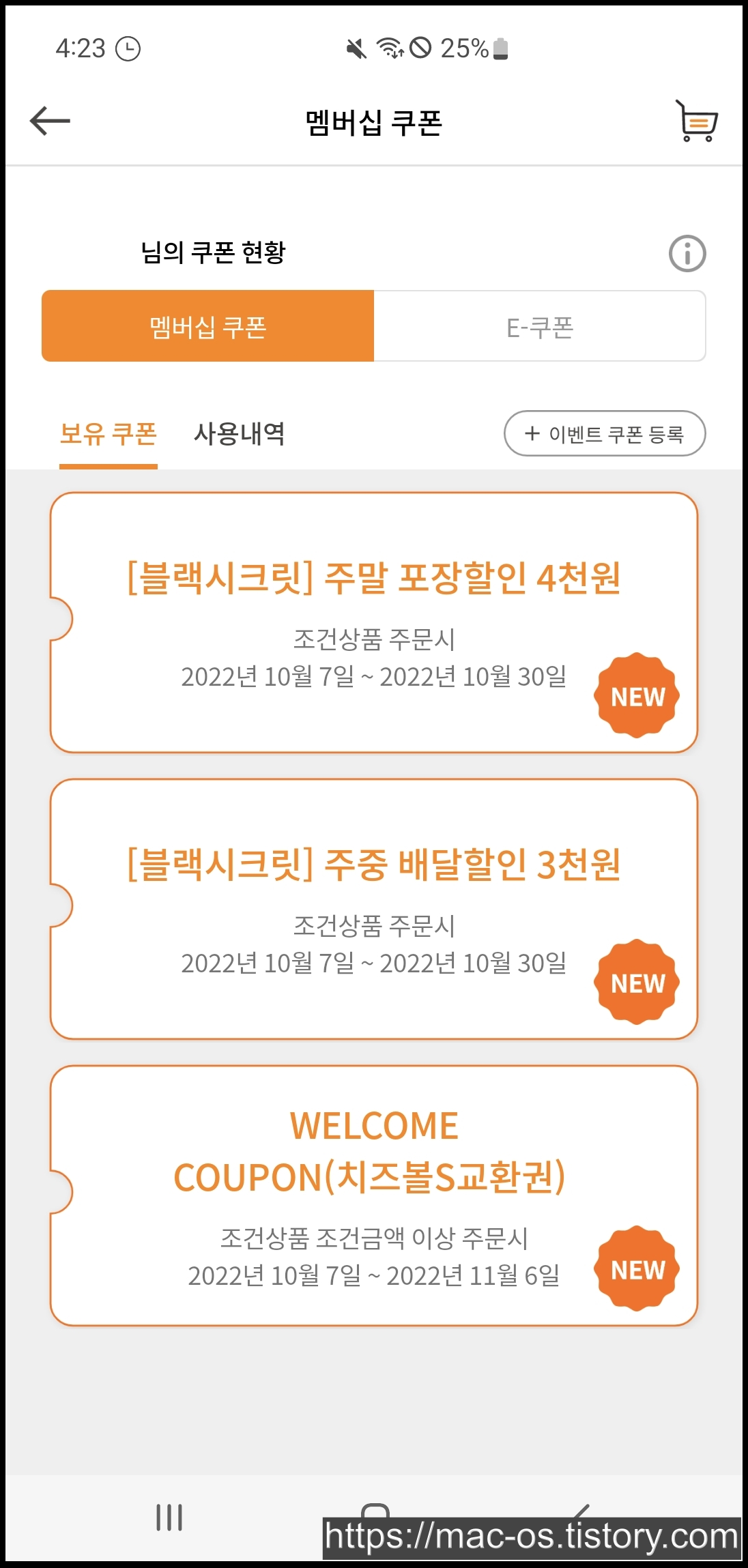 등급별 쿠폰은 매월 1일 자동 지급되며, 미사용된 쿠폰은 자동으로 소멸됩니다. 생일쿠폰은 생일 일주일 전에 발행된다고 하네요. 생일쿠폰은 어떤걸까요?
