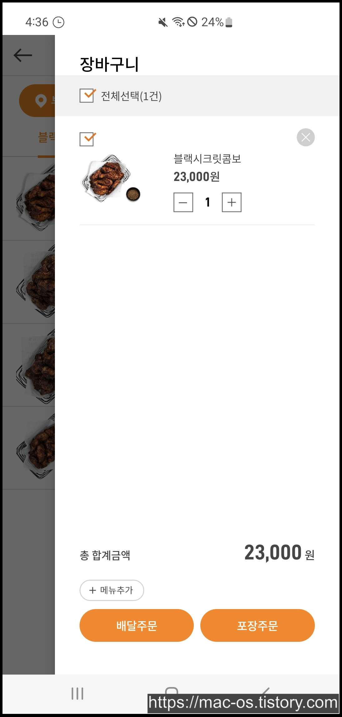 자신이 원하는 메뉴를 장바구니에 넣고 배달주문할건지 포장주문할건지 선택하고 결제정보를 입력합니다.