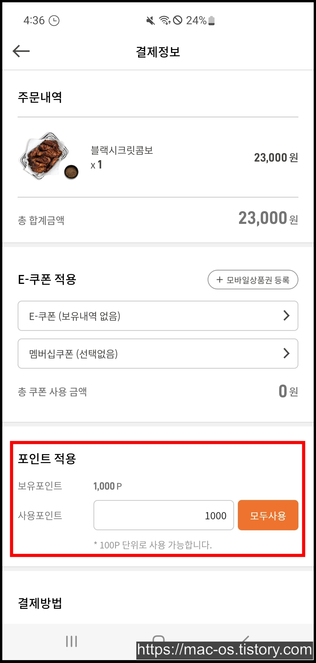 결제 페이지에서 교촌치킨 포인트를 현금과 같이 사용할 수 있습니다. 배달료를 제외한 결제 금액을 포인트로 모두사용도 가능합니다.