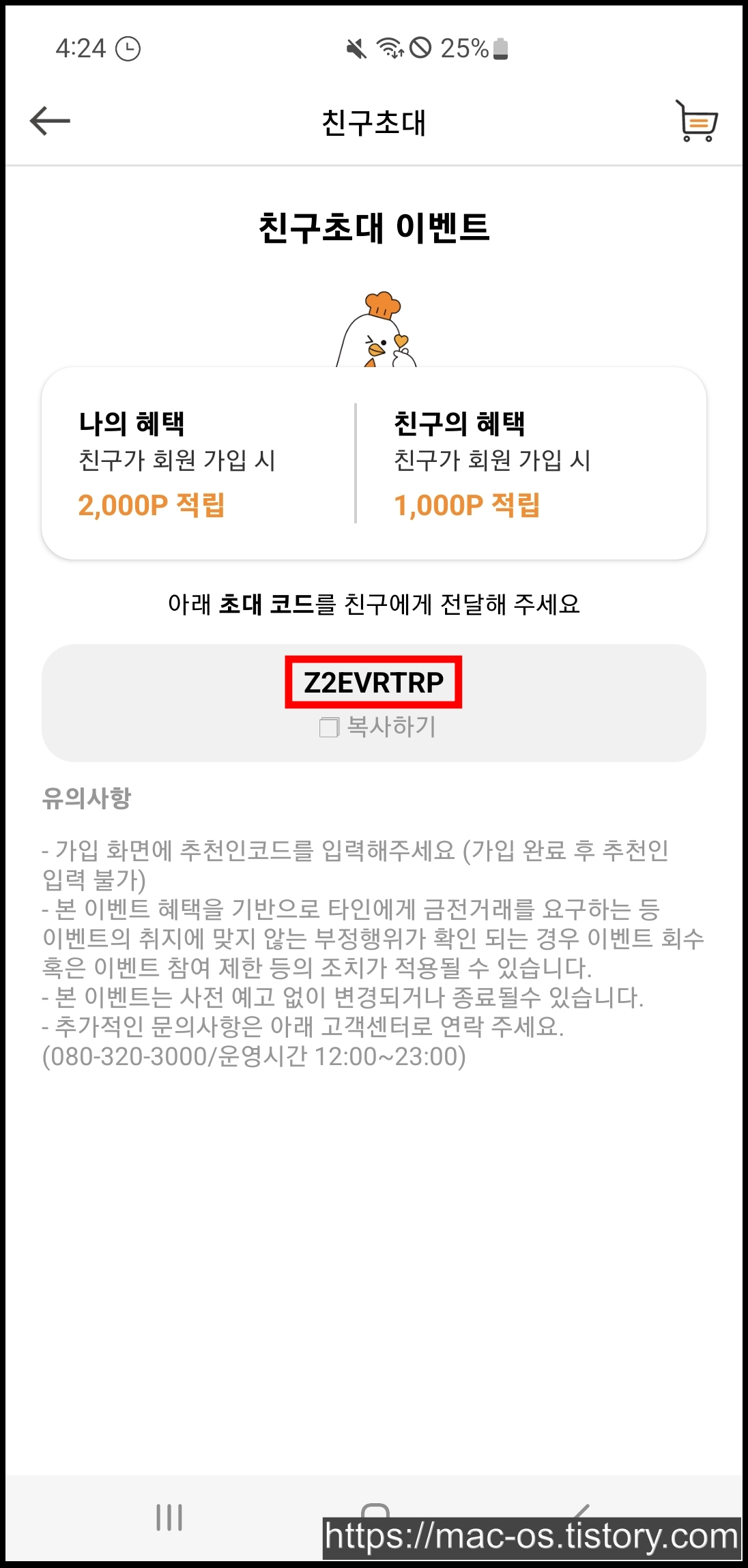 친구초대 이벤트는 생각보다 간단한데요. 자신의 추천인 코드로 친구를 교촌치킨 앱에 초대하면 나는 2,000P, 친구는 1,000P를 받게 됩니다.