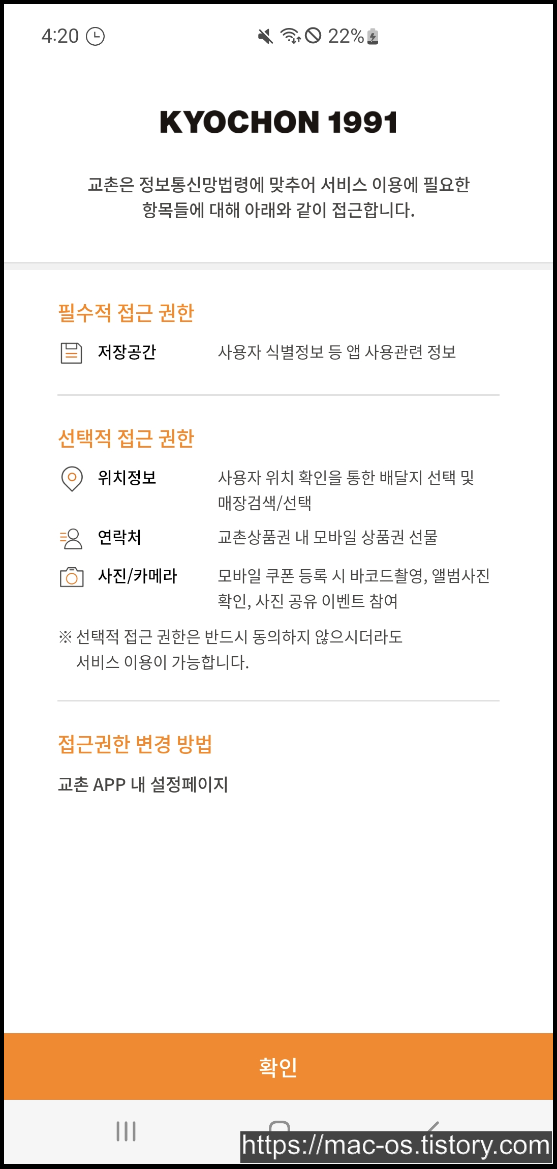 구글 플레이 스토어나 앱스토어에서 교촌치킨 앱을 설치하실 수 있습니다. 앱을 처음 실행하면 접근 권한을 허용해달라는 창이 뜨는데 허용해주면 됩니다.
