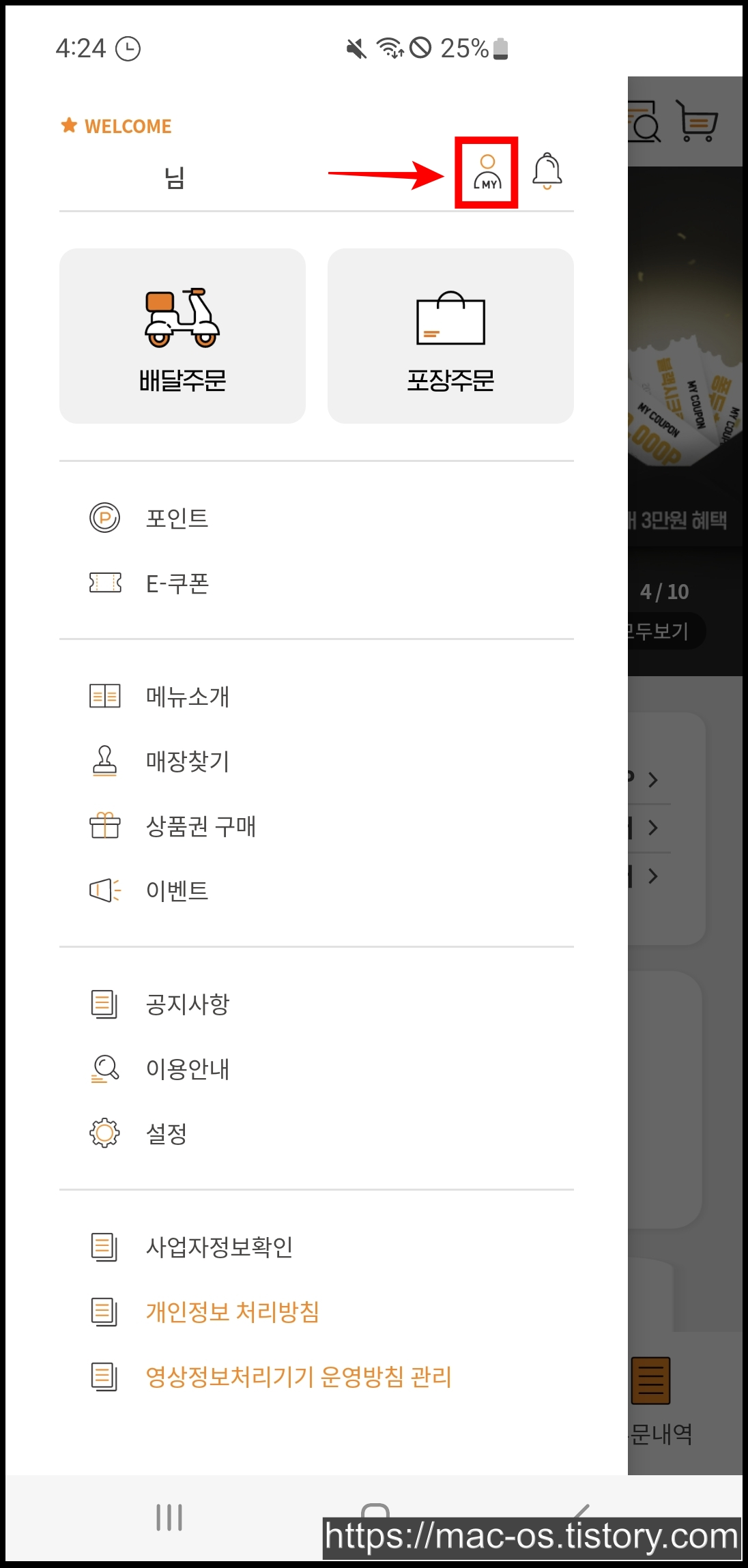 교촌치킨 홈 화면에서 좌측 상단 메뉴를 누르고, [MY]를 클릭합니다.