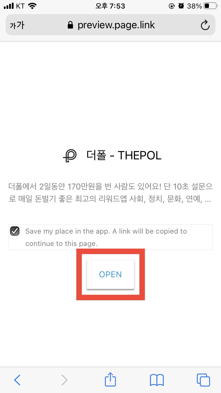 앞에 있는 더폴 친구초대 링크를 들어가신 다음, 'OPEN'을 클릭하여 앱스토어 설치 화면으로 이동해줍니다. 그리고 THEPOL 앱을 설치하고 실행해주세요.