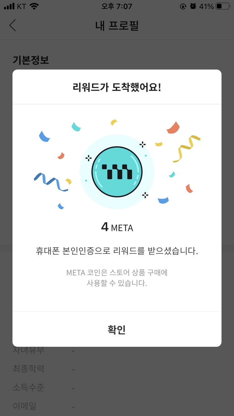 휴대폰 본인 인증을 하게 되면, 4META가 지급됩니다. 1META당 148원에 거래되고 있으니 4META는 592원 정도의 가치를 지닌다고 할 수 있습니다.