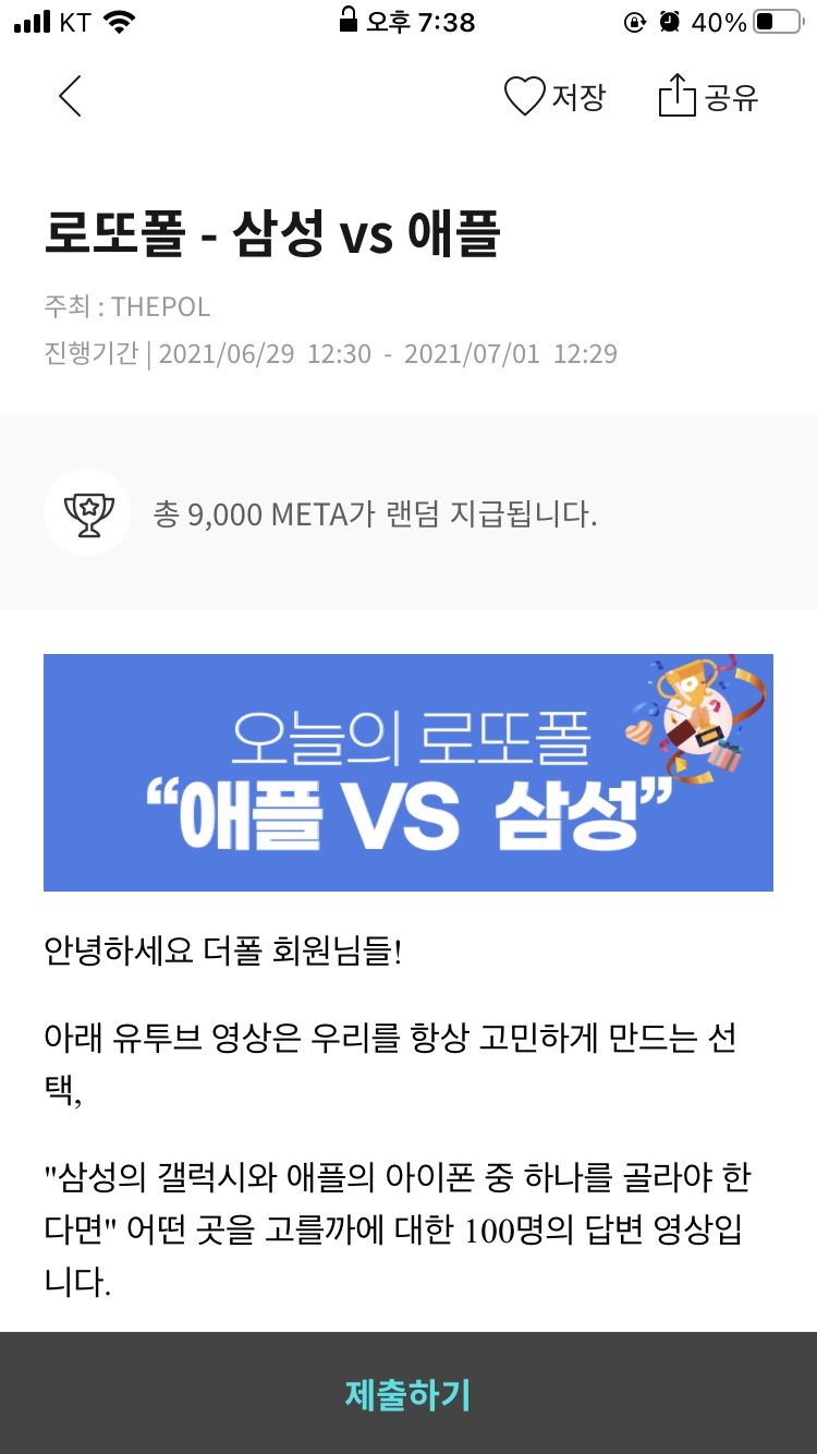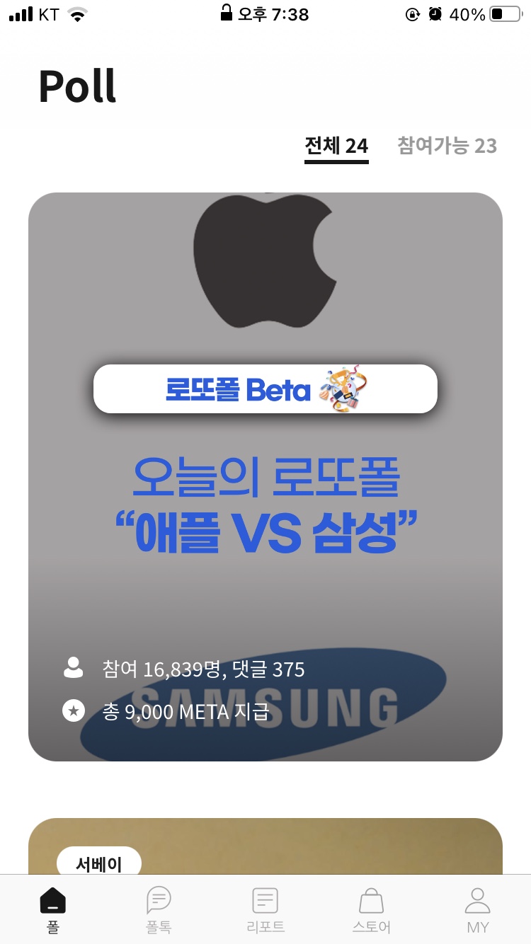 진행중인 폴에서 '애플 VS 삼성'이라는 로또폴에 참여해보았습니다. 선택지도 애플과 삼성 두 가지밖에 없어서 금방 끝납니다. 그리고 로또폴이라는 것도 있는데, 이건 폴에 참여하면 확률적으로 META를 지급해주는 것을 말합니다. 일종의 뽑기 느낌이지요.