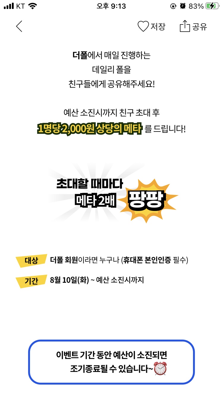 | 기존 더폴 친구초대 보상 1명당 1,000원 상당의 META ➞ 1명당 2,000원 상당의 META 지급 ('21.08.10 ~ 예산 소진 시까지) |