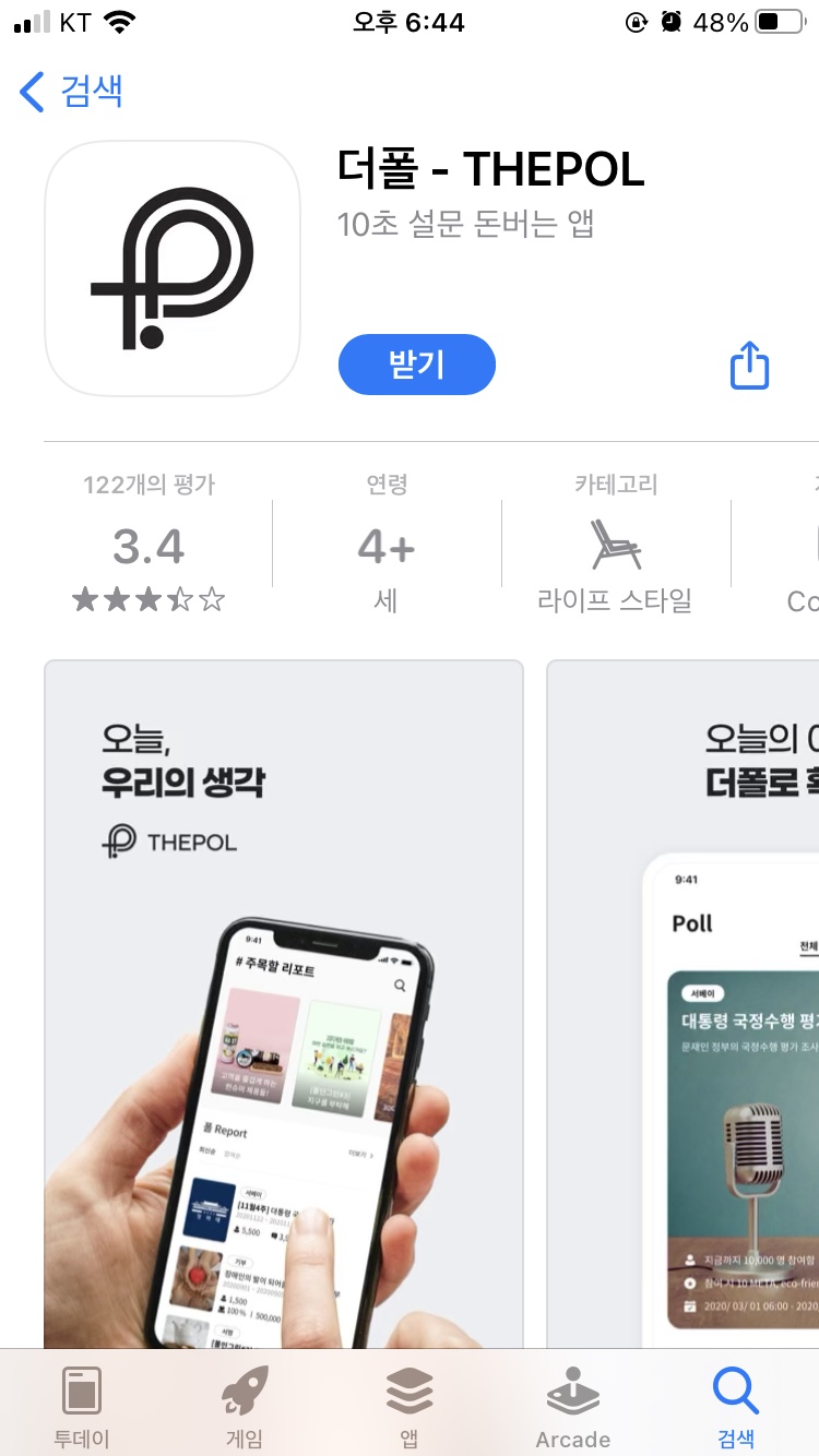 앱 이름은 '더폴(THEPOL)'입니다. 앱 내에 '폴'이라고 부르는 설문조사가 있습니다. 시사, 경제, 정치 등 다양한 분야에서 유저들을 조사하며 응답 시간은 약 10초 정도 소요됩니다.
