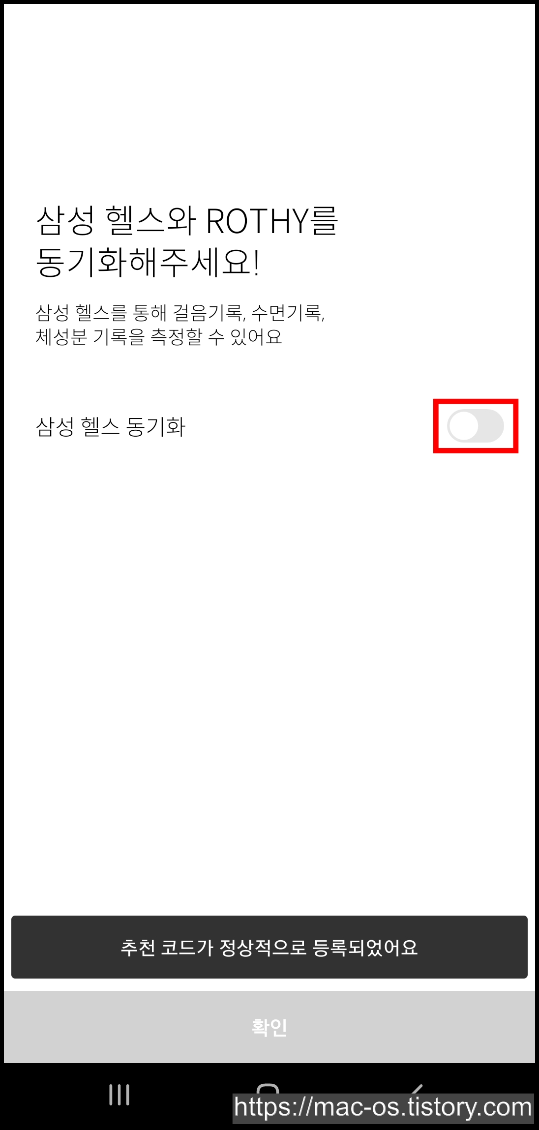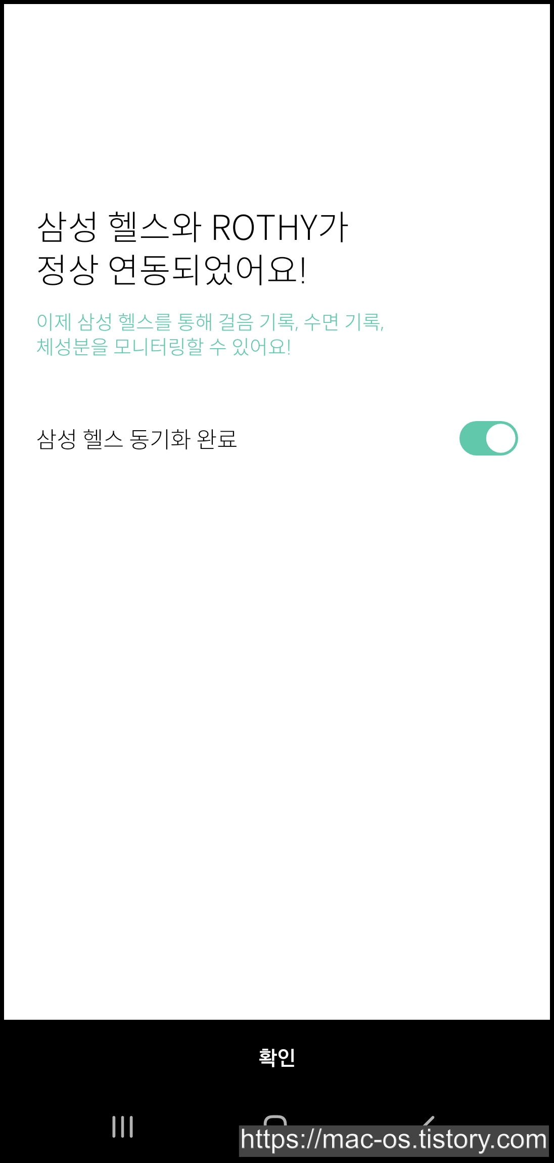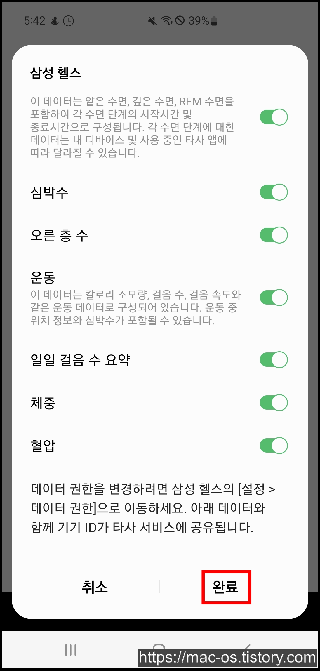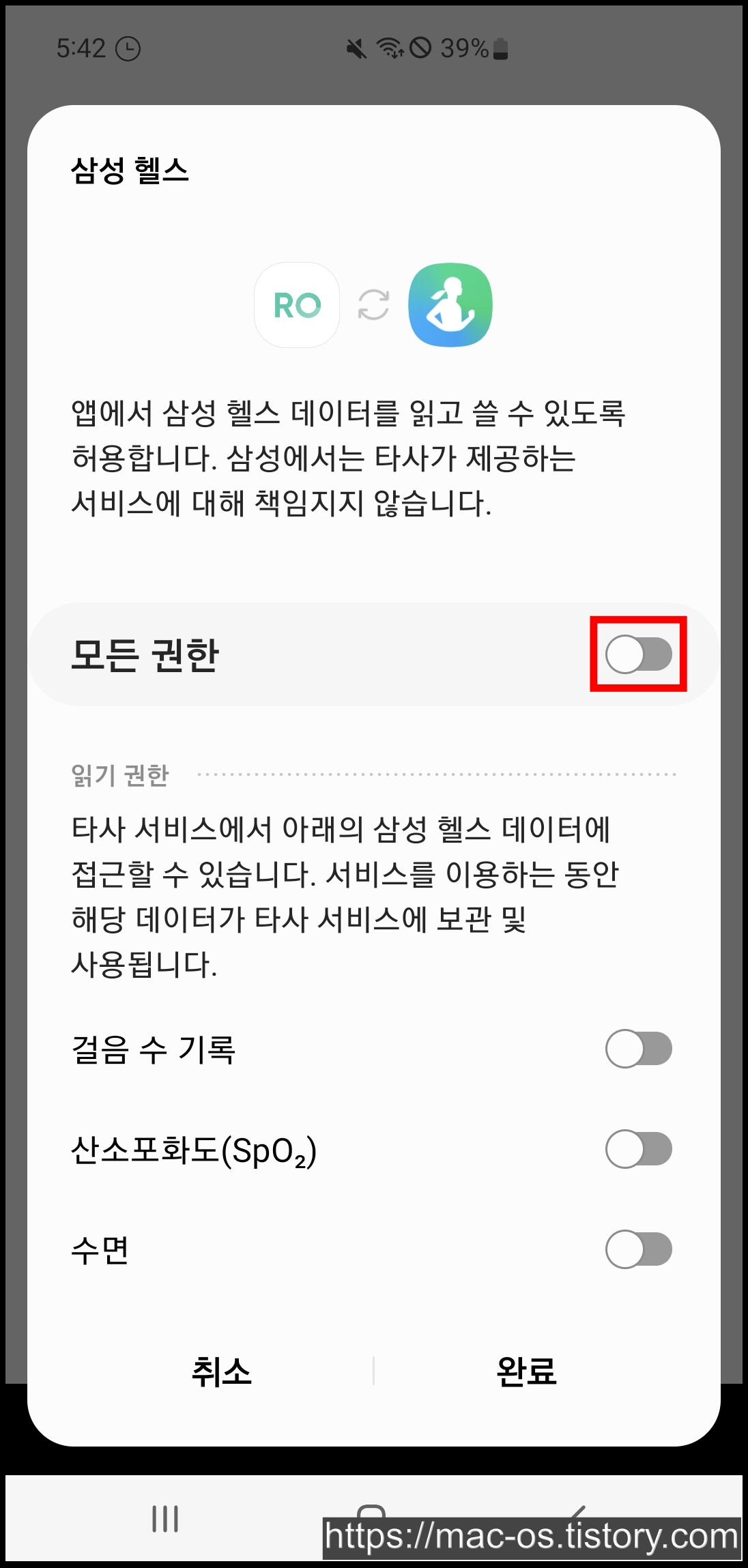 권한을 체크하고 [완료]를 누르면 삼성헬스와 로디가 정상적으로 연동됩니다.