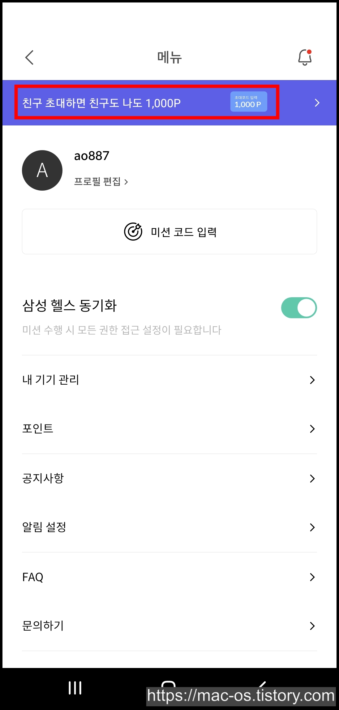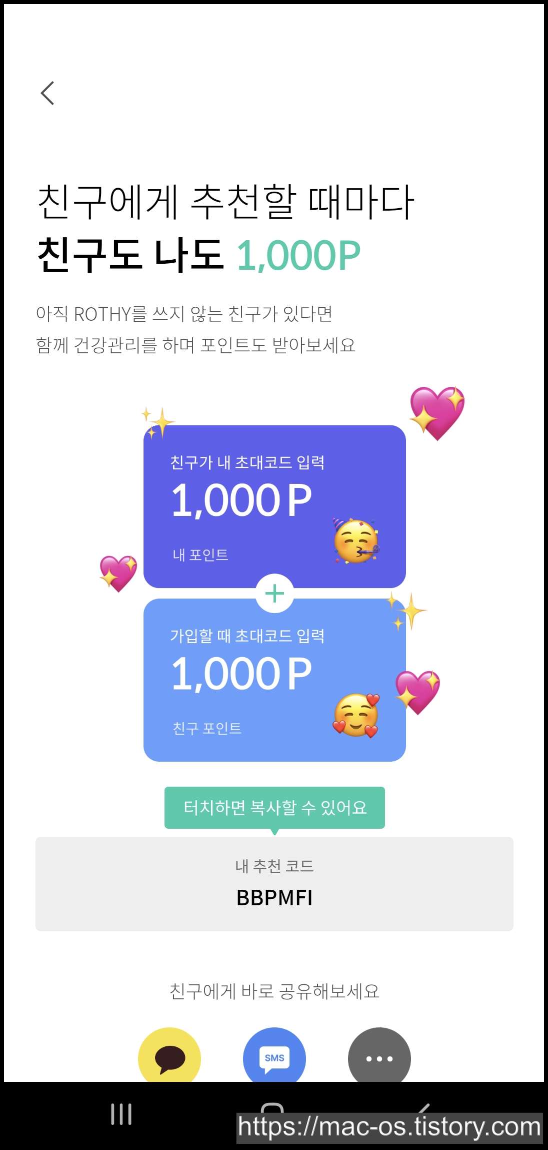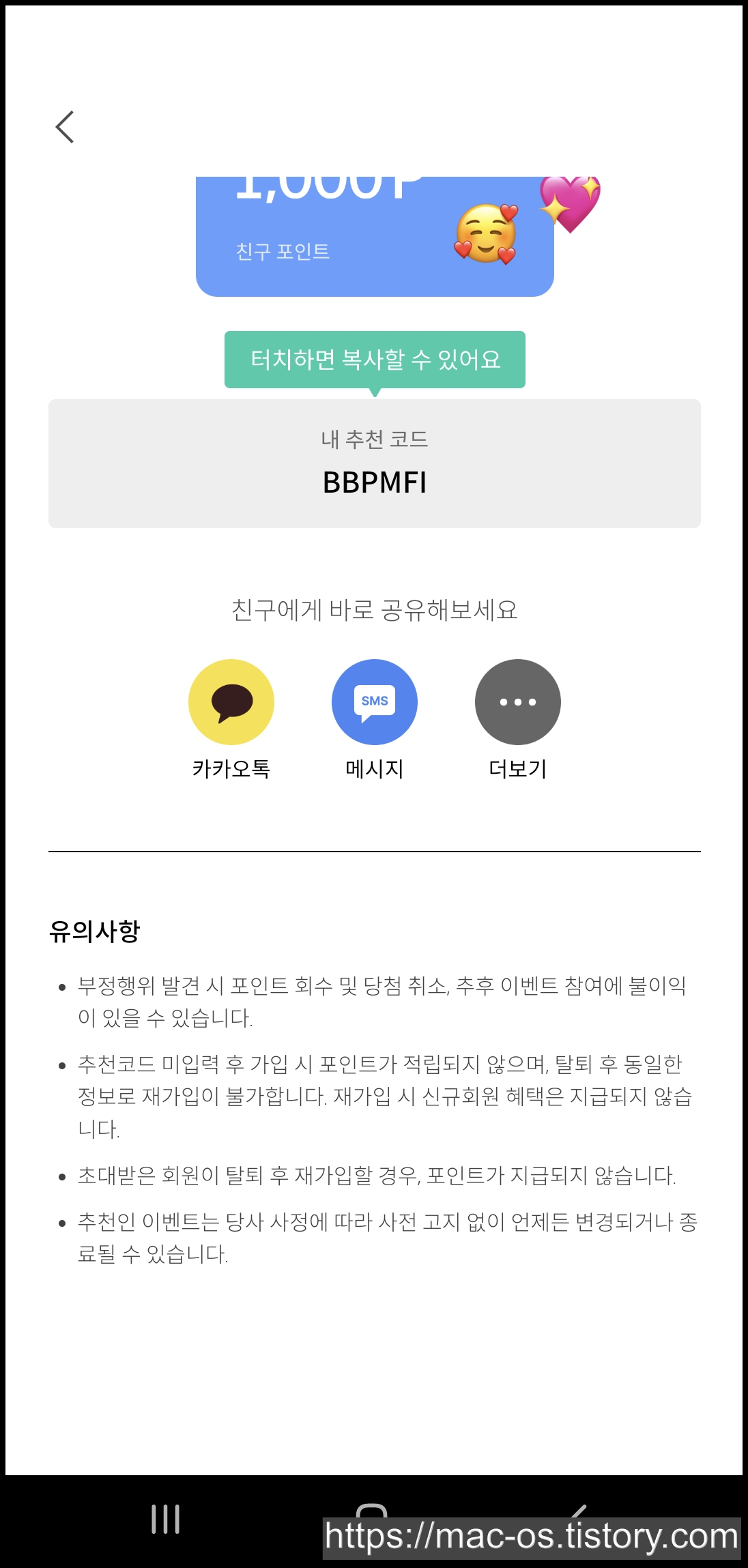 메뉴 상단의 친구초대 배너를 클릭하면 자신의 추천코드를 확인할 수 있어요.