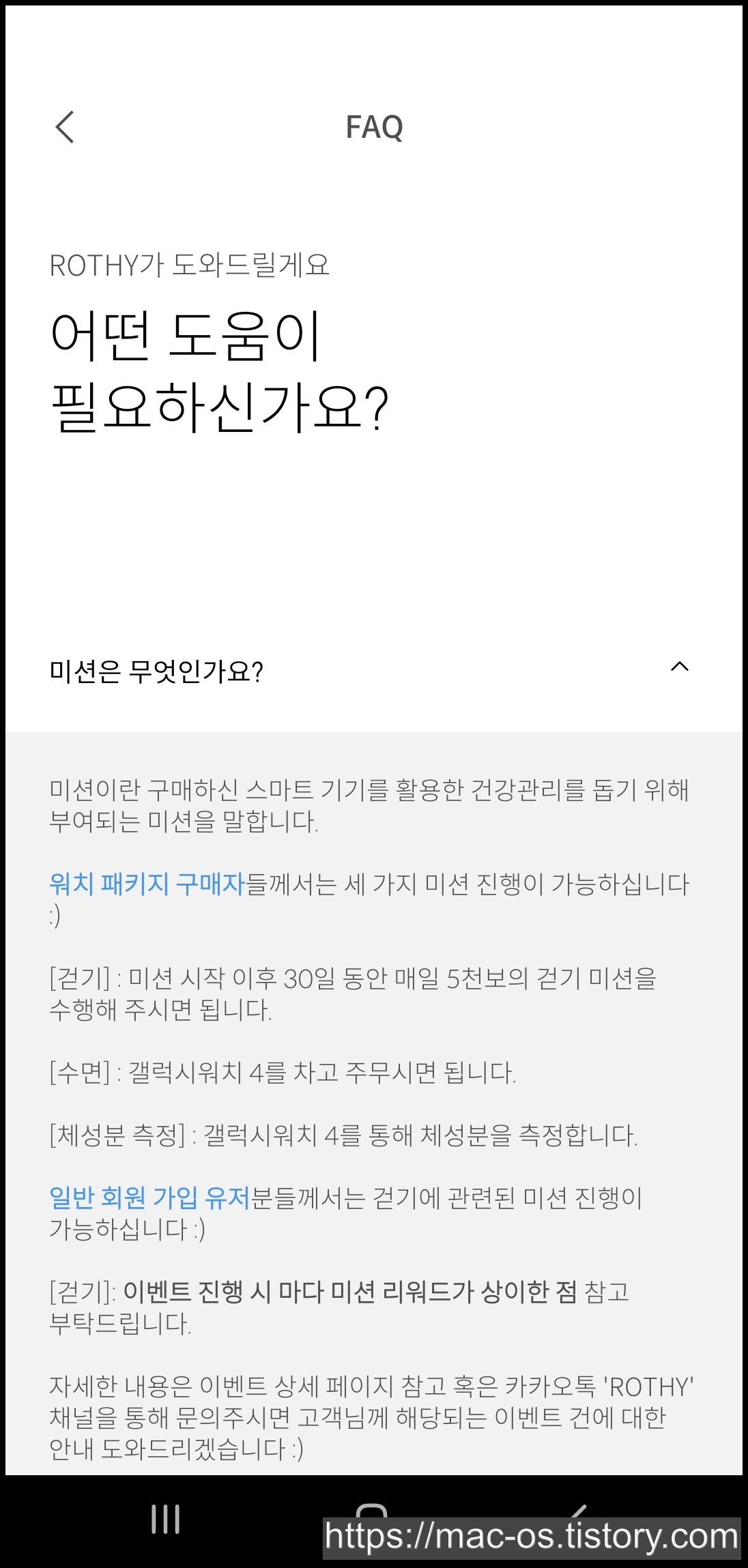 포인트 사용기한은 지급일로부터 6개월이구요. 미션이란 구매한 스마트 기기를 활용한 건강관리를 돕기 위해 부여되는 미션이라고 하는데요.